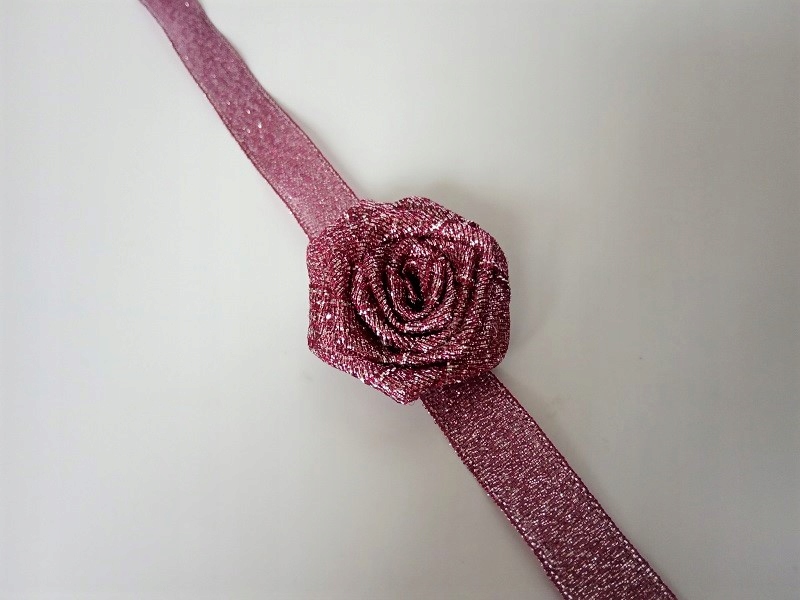 Прикраса виготовлена з троянди з атласної парчі та стрічки.