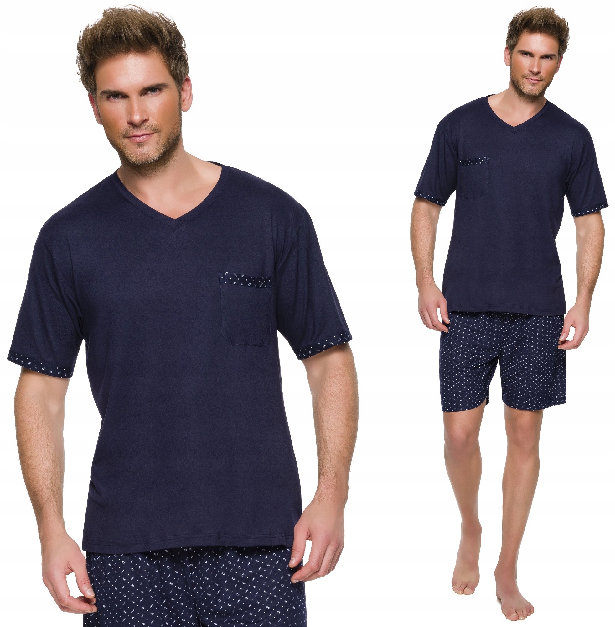 піжама складається з двох частин. Короткі штани на еластичній смузі. Гладка гора з короткими рукавами, кольори штанів на рукавах. З кишені на грудях.