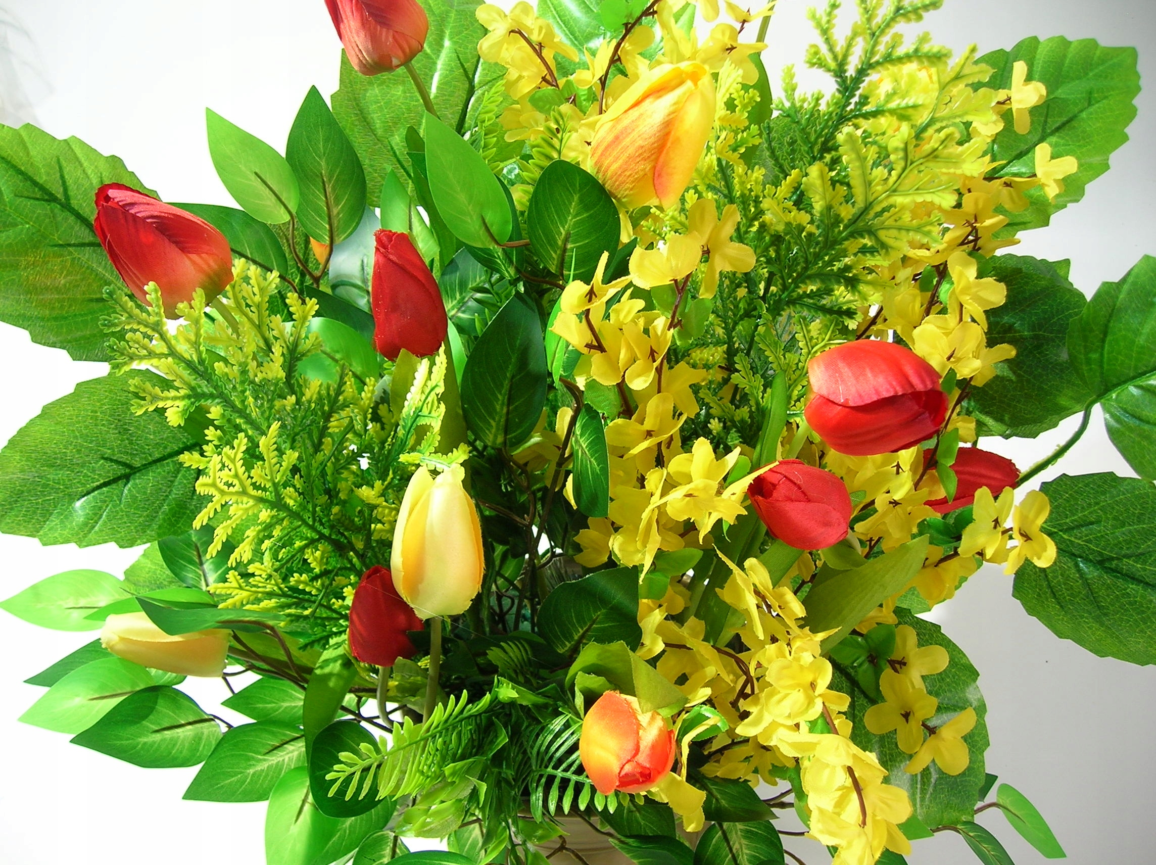 Предметом пропозиції є цвинтарний набір для могили. Набір складається з букета (вставка вази) та декору. Це поєднання красивих червоних і жовтих тюльпанів. Квіти сплетені зеленим листям, декоративними гілочками та жовтими весняними форзиціями, які підкреслюють їх колір.