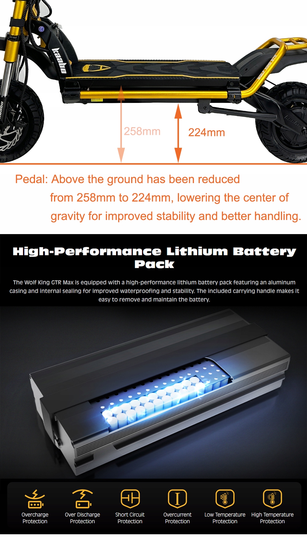 - Надійна конструкція: З рейтингом водонепроникності IPX5 і вагою 67 кг Wolf King створений для довговічності та продуктивності в різноманітних умовах.