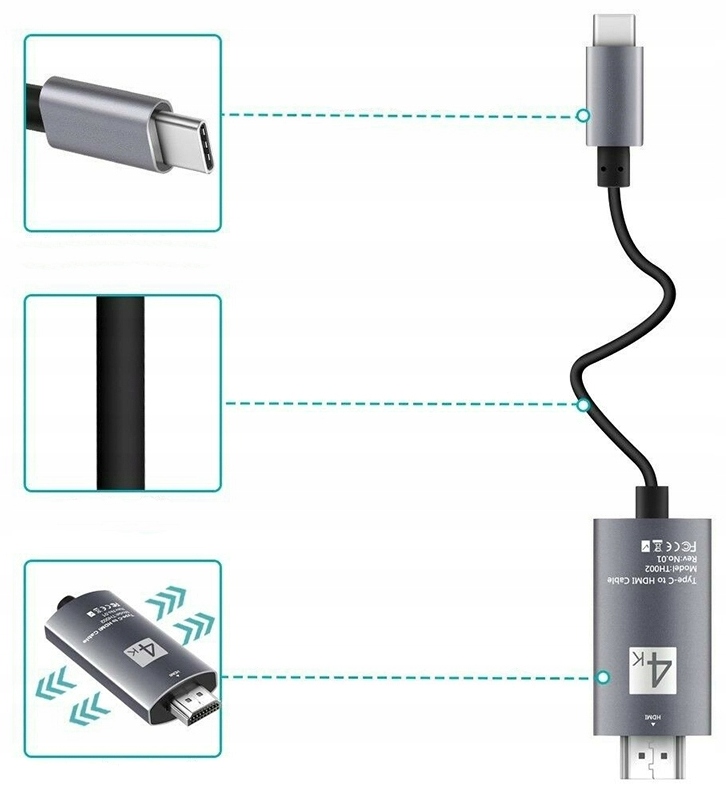 Зображення передається 1:1 у повному форматі 4K, що означає, що телевізор відображатиме точно те саме як на підключеному пристрої. Пристрій повинен мати роз’єм USB-C 3.1 і підтримувати перетворення на HDMI. Кабель не вимагає додаткового джерела живлення.