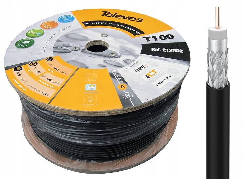 Внутрішній провідник (жила) кабелю Televes T-100 діаметром 1,13 мм виготовлено з чистої міді. Екрануюча фольга і оплетка кабелю з алюмінію з покриттям 77%, що забезпечує повну відповідність стандарту класу А. Кабель має дуже хороші параметри загасання, тому його можна використовувати в установках до 3 ГГц.