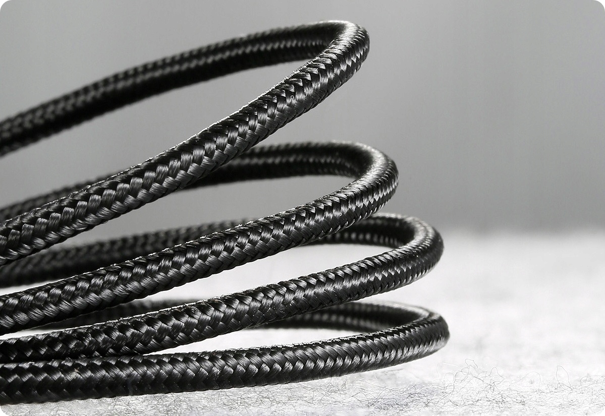 Тканина з нейлонового волокна, щільно обгорнута навколо кабелю, забезпечує додатковий захист, гнучкість і міцність. Конструкція допомагає зменшити зношування та покращує довговічність, дозволяючи легко впоратися з повсякденним використанням.