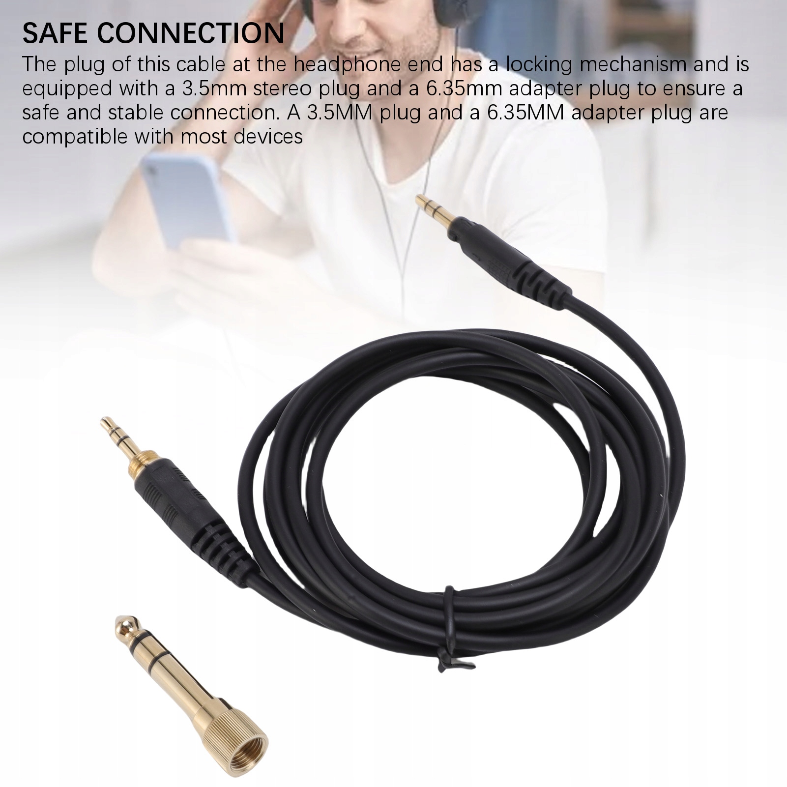 2. Безпечне з'єднання: пробка в цьому кабелі в кінці навушників та механізму блокування та сейфу до 6,5 мм, а також сейф на 3,5 мм стверджо, що виписується 3,5 мм стерегій стерео. стабільне з'єднання. 3,5 мм вилку та 6,35 мм -апаратний плагін сумісні з більшістю пристроїв