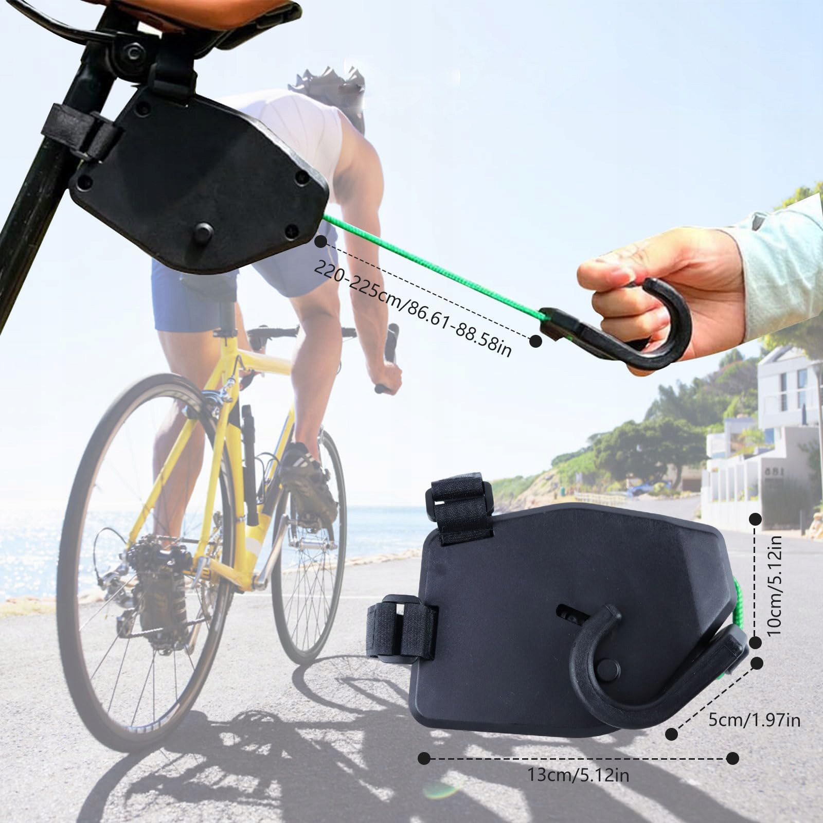 Гнучка буксирна мотузка для велосипеда є сильною і гнучкою для поглинання ударів та ударів, забезпечуючи зручну адгезію під час руху в гору, не підключивши колесо. Він витримує вантаж 225 кг/500 фунтів, завдяки якому родина гірських велосипедистів може насолоджуватися більшими атракціонами.