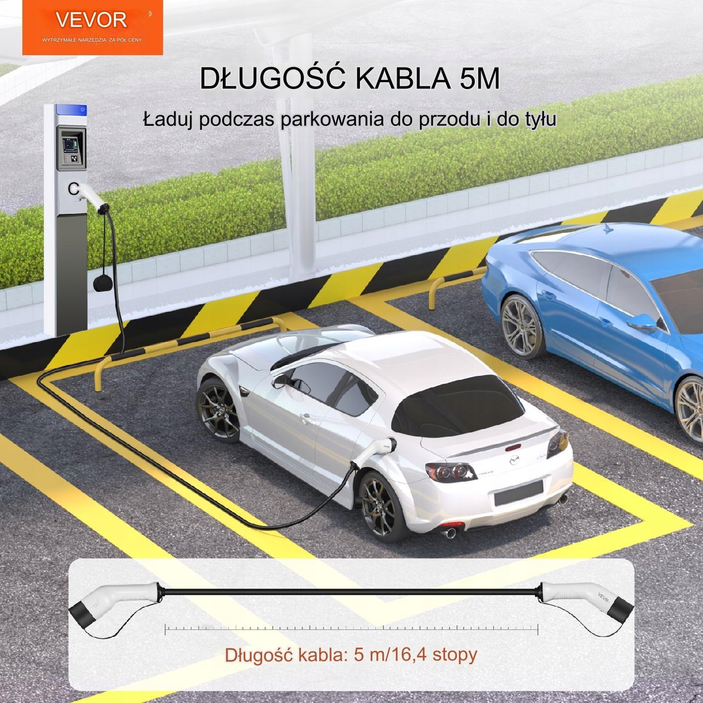 - Кабель для заряджання електромобіля завдовжки 5 м, сумісний із зарядними пристроями типу 2 (IEC62196).