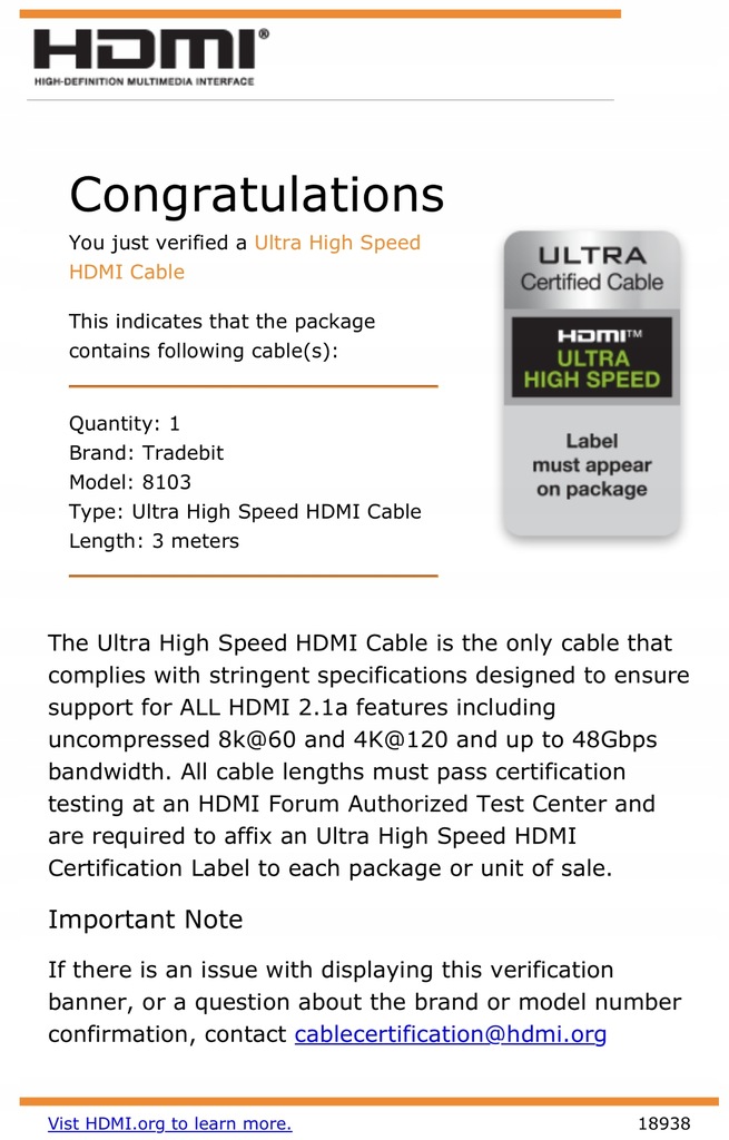 ➡️ Сертифікований кабель HDMI 2.1 Tradebit від HDMI.org
