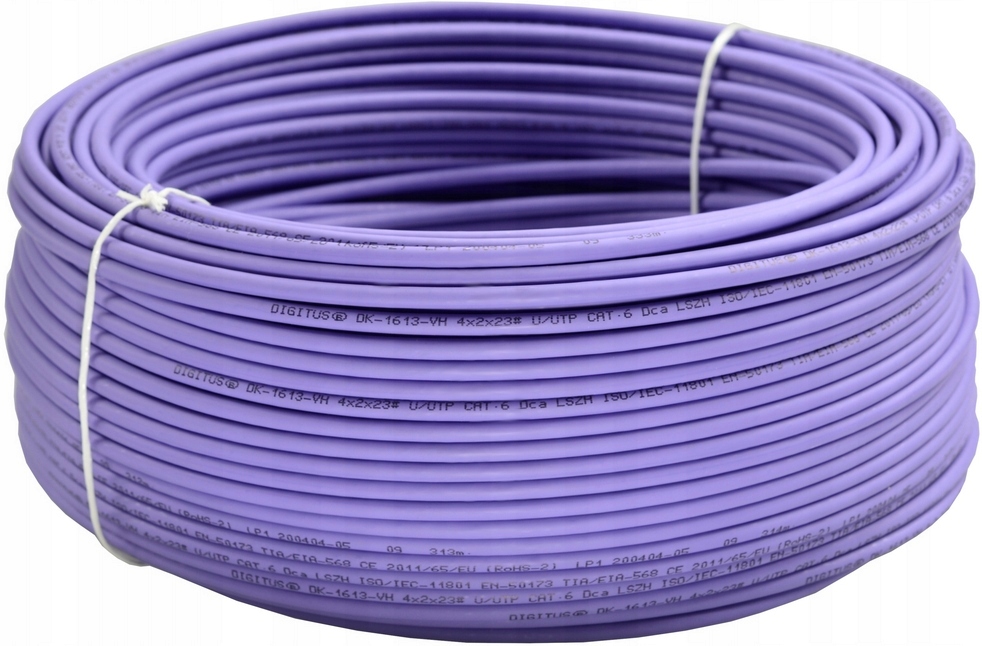 Інсталяційні кабелі DIGITUS® категорії 6 U-UTP виробляються та перевіряються відповідно до специфікацій стандартів ISO/IEC 11801, DIN EN 50173 і DIN EN 50288-5-1 категорії 6. Кожен кабель складається з 8 поліетиленових ізольованих провідники з кольоровим кодом AWG 23. Інформація, надрукована на зовнішній оболонці кабелю, включає назву марки, код товару та довжину кабелю.