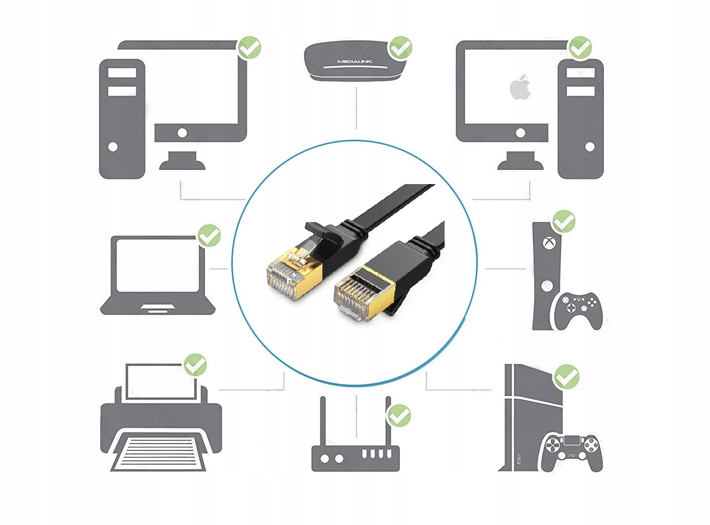 - Посилені, позолочені штекери RJ45, ПЛОСКІ