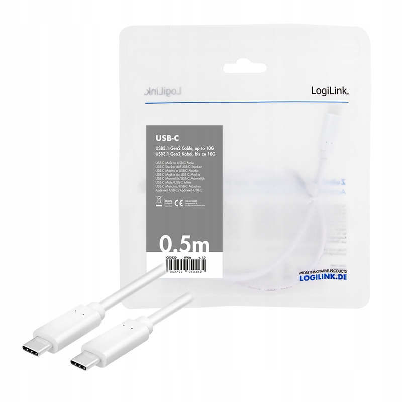 Кабель Logilink USB-C, 0,5 м, 4K/60 Гц, 100 Вт PD, 10 Гбіт/с, E-mark, 10 Гбіт/с, білий