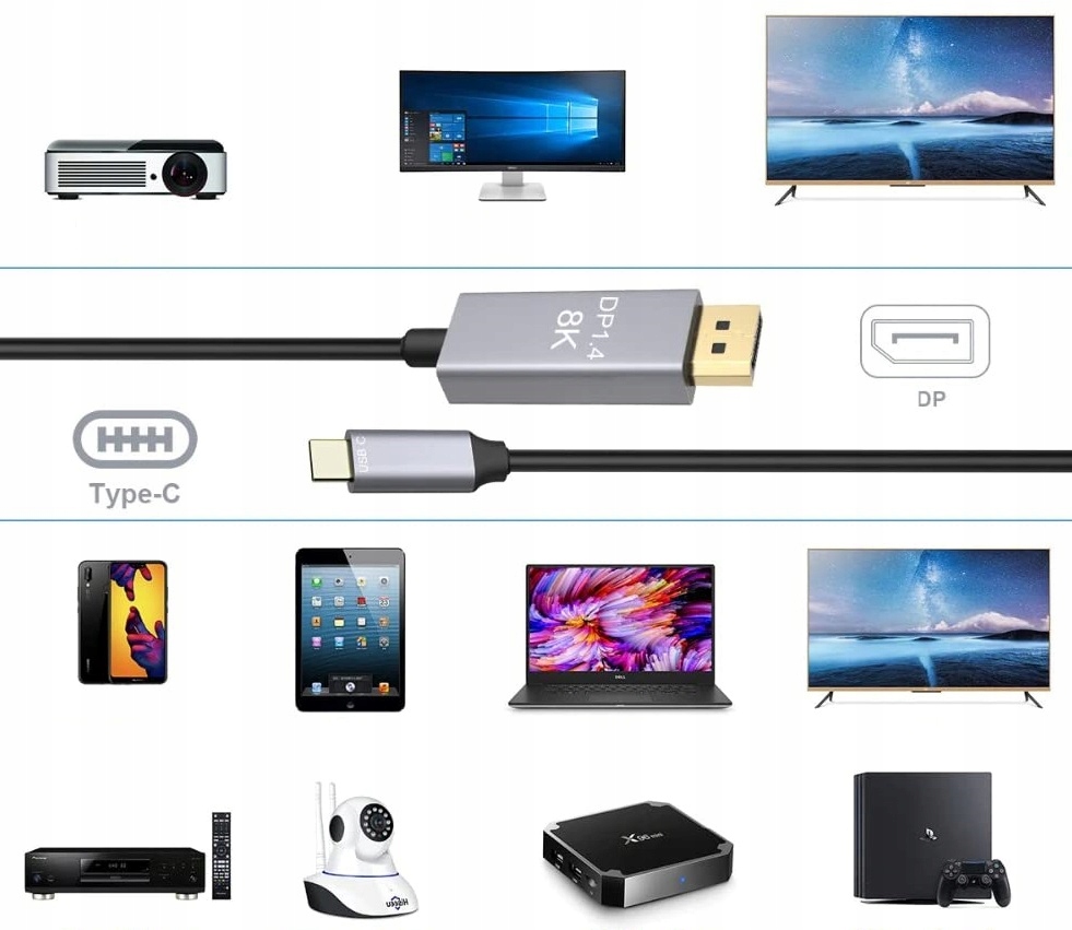 Кабель USB-C – DP 8K забезпечує стабільне та надійне з’єднання між вихідним пристроєм і дисплеєм. , що дозволяє передавати зображення в роздільній здатності 8K. Це означає, що користувачі можуть насолоджуватися неймовірно чіткими зображеннями.