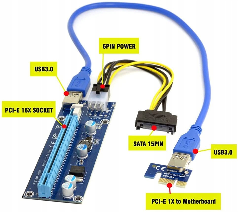 - Адаптер розширення PCI-E 1 x до 16 x Mining Device Enhanced Extension Adapter з USB 3.0 і 6-контактним кабелем живлення SATA