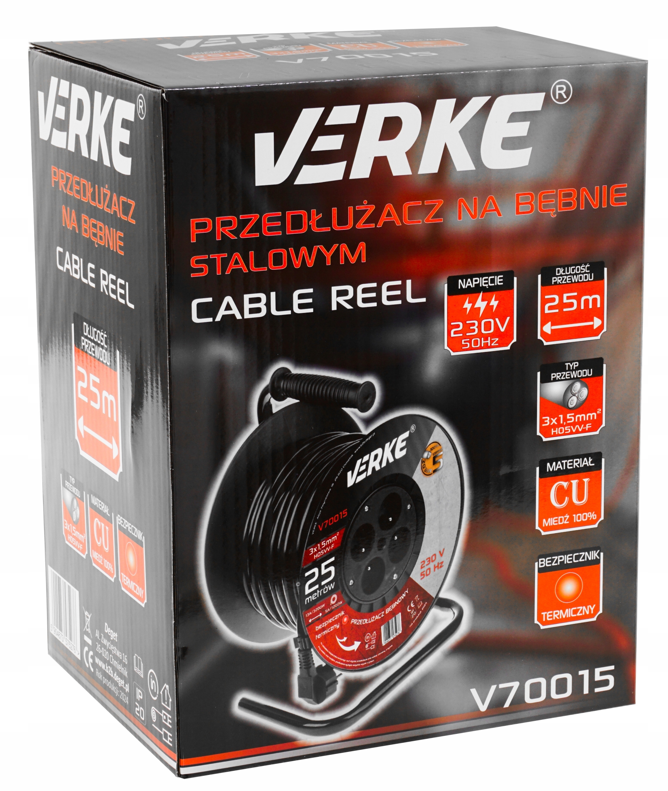 Кабель-подовжувач виготовлено з матеріалів найвищої якості, тому його барабан і каркас зроблені з металу, що значно підвищує довговічність, корисну під час важких завдань на будівництві чи на складі