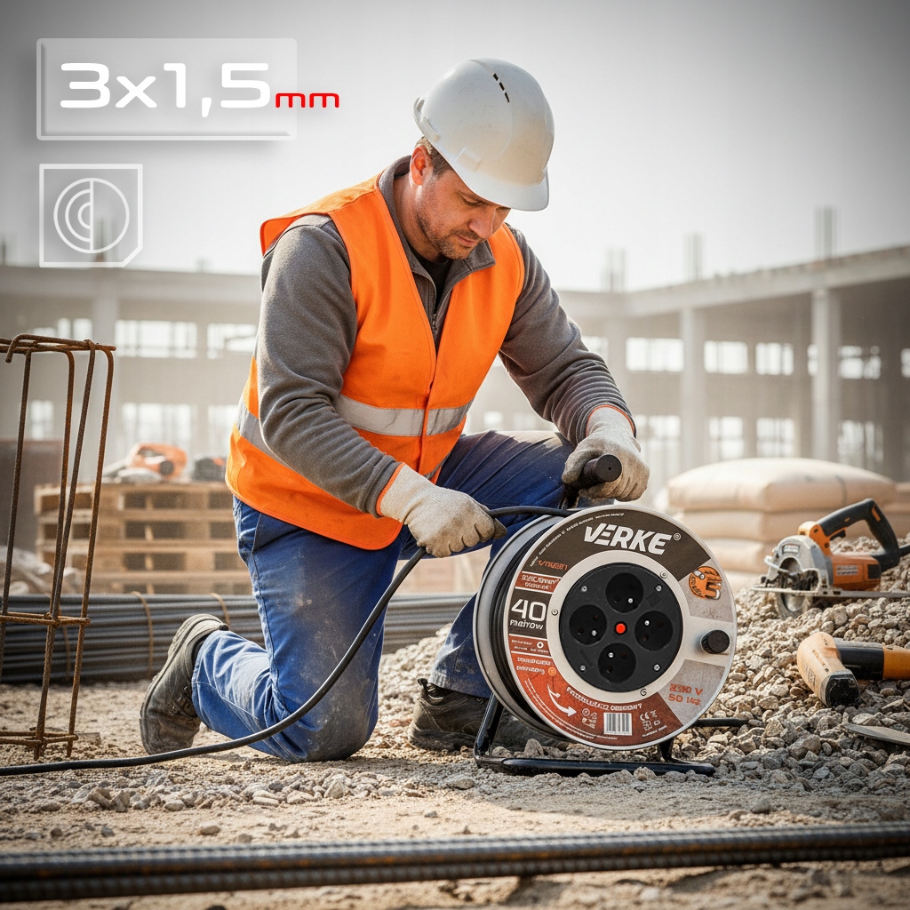 Кабель-подовжувач на котушці високого класу, довжиною 40м, на 4 гнізда. Кабель складається з 3 мідних дротів перетином 1,5 мм² кожен. Такий переріз кабелю дозволяє одночасно підключати до цих подовжувачів чотири пристрої, що особливо корисно на будівельних майданчиках або в майстернях. Кабелі покриті ПВХ ізоляцією, яка має високу стійкість до механічних пошкоджень, атмосферних факторів і хімічних речовин. Подовжувач оснащений термозапобіжником.