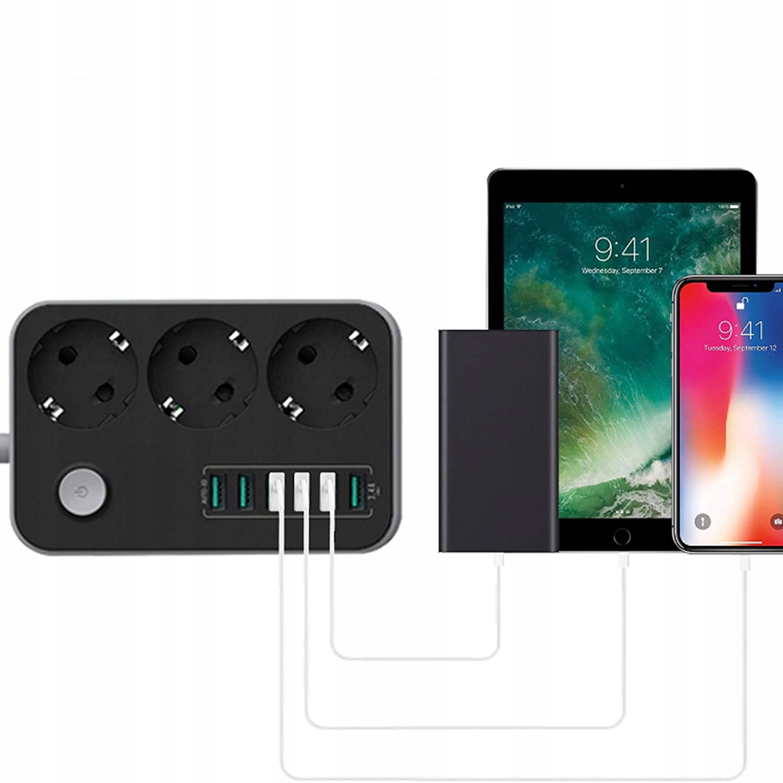 USB-порти оснащені автоматичним регулювання струму на підключений пристрій до 4.1A, що дозволяє швидко заряджати смартфон, планшет, павербанк і при цьому підключати Телевізор, ноутбук або нічник.