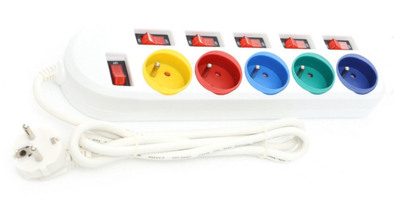 Білий подовжувач із 5-метровим кабелем, головним вимикачем та окремими вимикачами для кожної розетки. Є захист від дітей. Для легшої ідентифікації під’єднаних кабелів використовується індивідуальне кольорове маркування для кожної розетки.