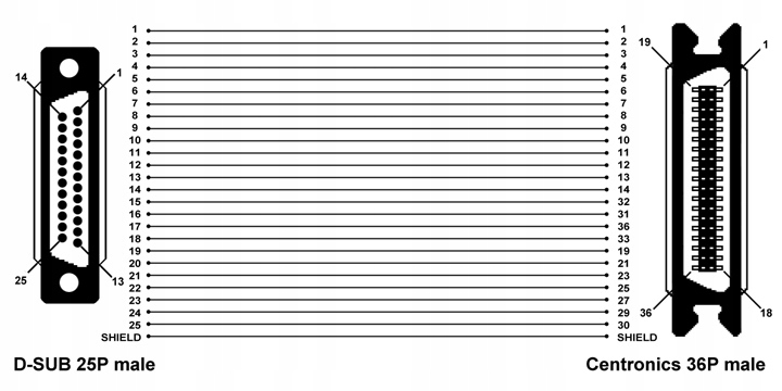 standard lpt (паралельна порт, центральна)-це розмовна назва комп'ютерних пільгій, що використовується в 1970-2000-річному. Як принтери, сканери, сюжетки тощо, хоча він був замінений стандартом USB, деякі пристрої (медичне обладнання, друкарські машини, сюжетки) мають з'єднувачі цього стандарту. Пропонований кабель використовується для підключення периферійного пристрою з портом Centronics 36P з комп'ютером з паралельним портом D-Sub 25p. Підключення -це кабель з повним 25 життєвим персоналу шпильок до двох шляхів передач даних (Bi -Drecectional) на високих швидкостях -схема нижче: