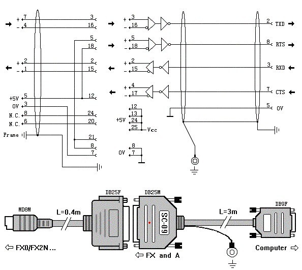 Кабель можна використовувати для програмування серії FX0N/S контролери , FX1N/S, FX2N, FX3U, FX3G.