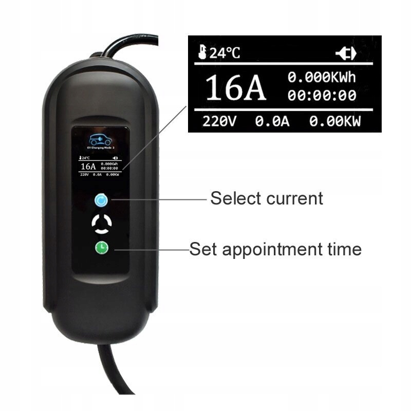Синя кнопка регулює струм. Щоб змінити струм, натисніть синю кнопку. Під час регулювання струму штекер живлення завжди під’єднано, а штекер типу SAE J1772 1 (або тип 2) від’єднано. Отримавши потрібний струм, підключіть його до розетки та почніть заряджати.
