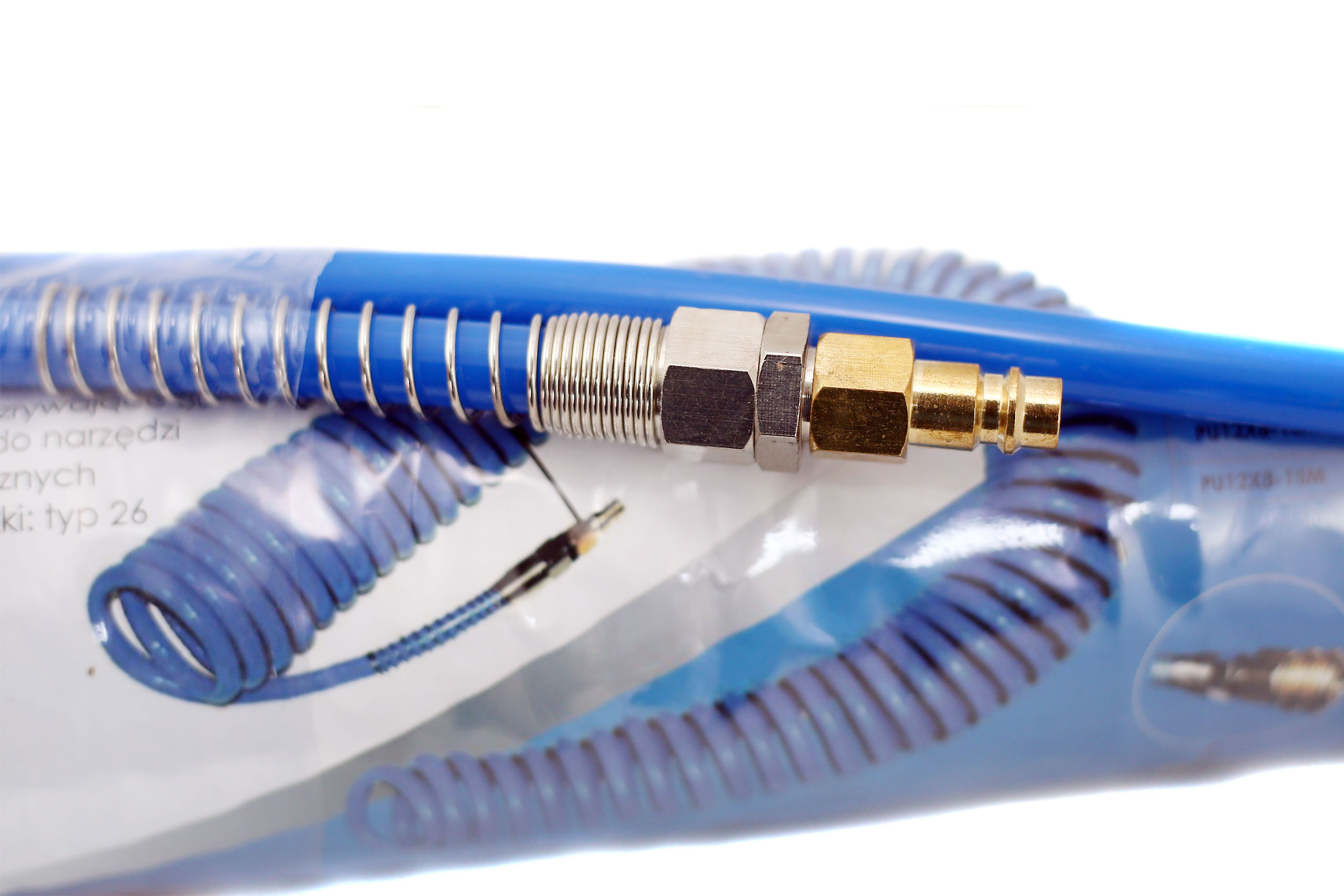 Спіральний пневматичний шланг із швидкими з'єднувачами. Призначений для використання на заводах, в гаражах, майстернях - скрізь, де використовуються пневматичні пристрої. Робить підключення компресора до пристроїв простішим і швидшим. Безцінний для накачування, видування та фарбування пістолетів, різних типів пневматичних гайкових ключів, мастилок та інших інструментів. Витримує значні перепади температури. Виготовлений зі стійкого до розтріскування поліуретану, має високий тиск розриву (30 бар). Спіральний характер шланга дуже зручний для зберігання та транспортування. Після згортання шланг займає близько 10% його загальної довжини.