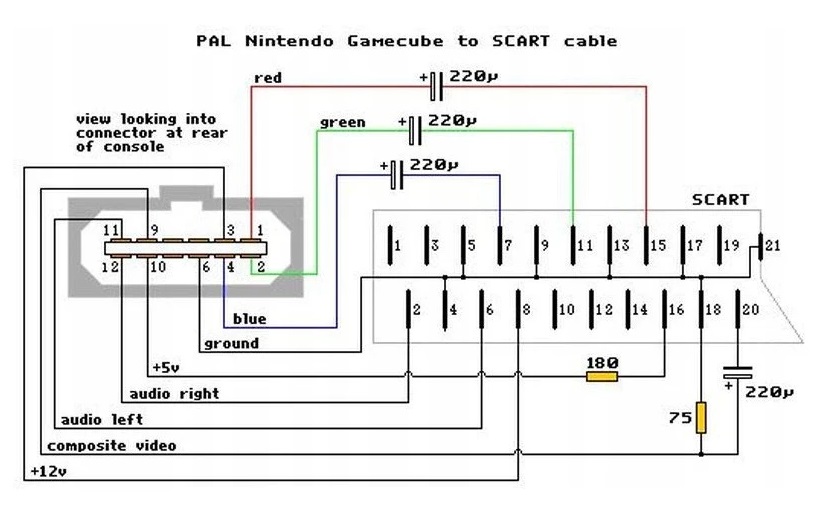 Кабель RGB для підключення консолі SNES, Nintendo 64, GameCube у версії PAL (ЄС) до гнізда SCART на телевізорі. Кабель RGB забезпечує вищу якість зображення, ніж кабель AV (3 RCA штекери).