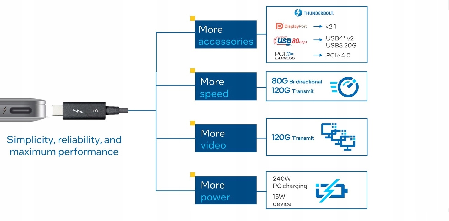 Навіть якщо у вас немає комп'ютера, оснащеного Port Thunderbolt 5, кабель Thunderbolt 5 не залишить вас позаду. Незалежно від того, який інтерфейс Thunderbolt 4, Thunderbolt 4 або USB-C має ваш комп'ютер, планшет або пристрій, завдяки універсальному роз'єму кабелю USB-C Thunderbolt 5 Ви збільшите свою швидкість до максимальної.