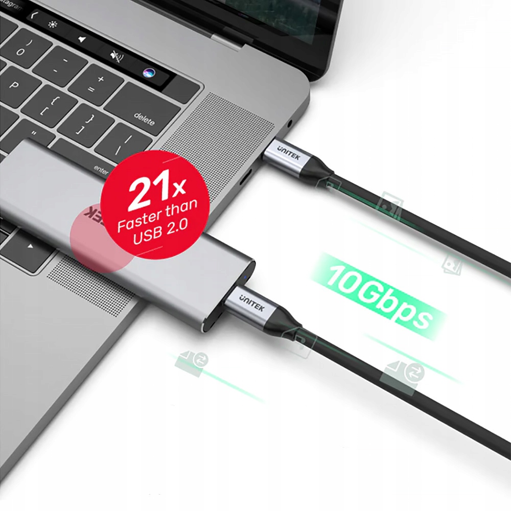 Стандарт USB 3.1 Gen 2 забезпечує передачу даних на швидкості 10 Гбіт/с, що є найшвидшим USB наразі на ринку. З такою пропускною здатністю синхронізація файлів на пристроях, копіювання дисків або фотографій займає буквально мить, а кабель також можна використовувати як чудовий відеокабель.