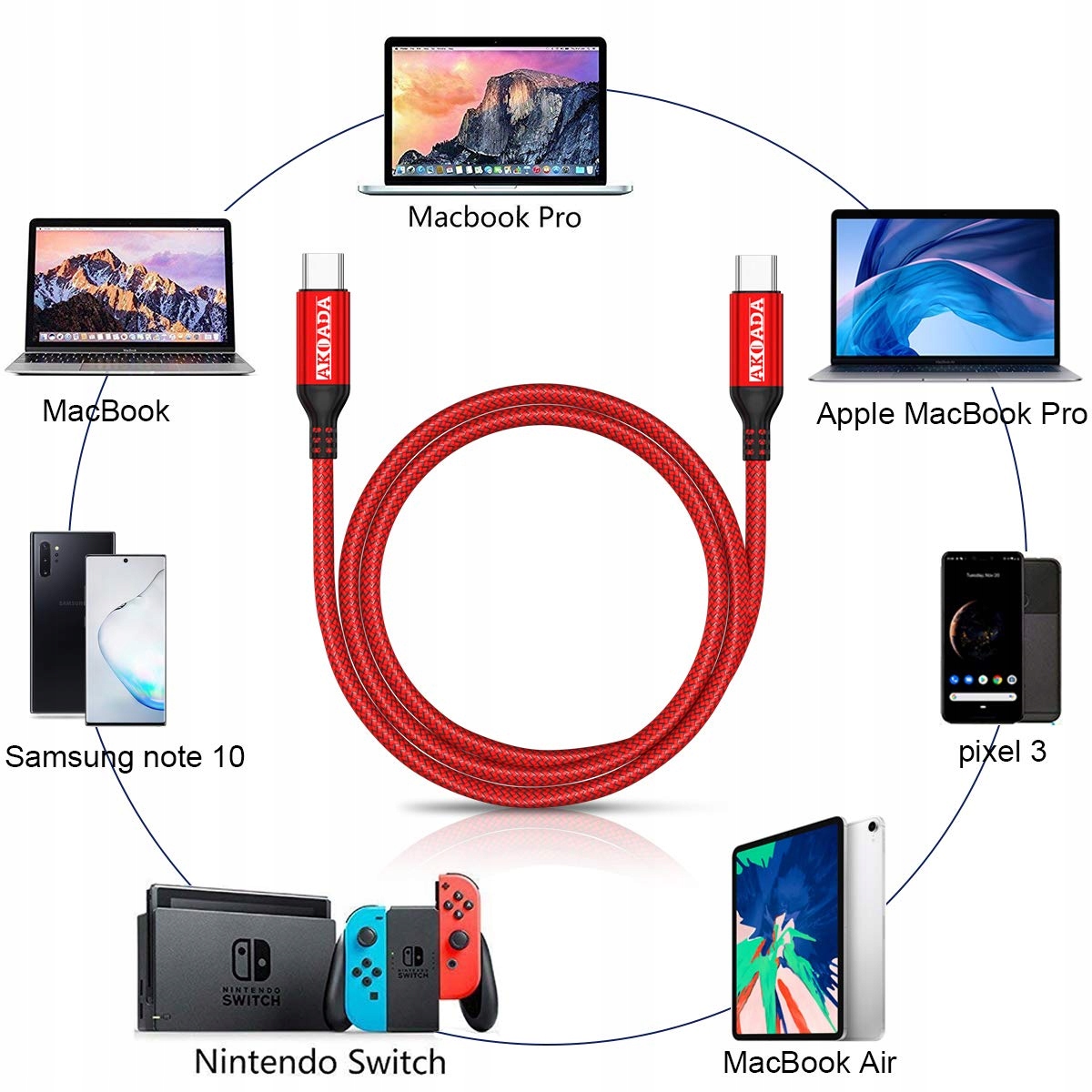 Кабель USB C, тип USB C, червоний, 20 В, 5 A, Akoada 2 м