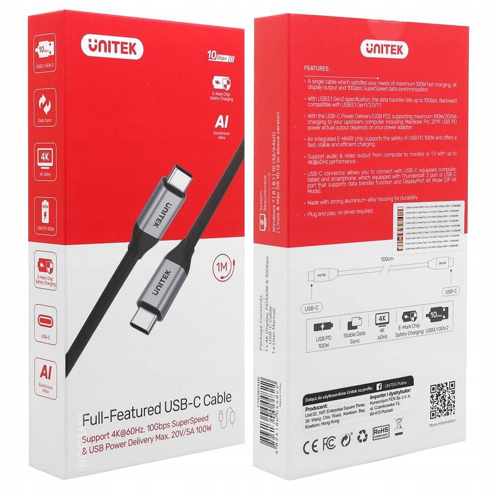 Кабель має специфікацію USB 3.1 Gen 2, що означає, що він може передавати дані зі швидкістю 10 Гбіт/с. Він ідеально підходить для копіювання файлів або фотографій. Кабель Unitek також підтримує швидку зарядку 100 Вт (20 В/5 А), що робить його ідеальним для заряджання ноутбуків або смартфонів за допомогою швидкої зарядки.