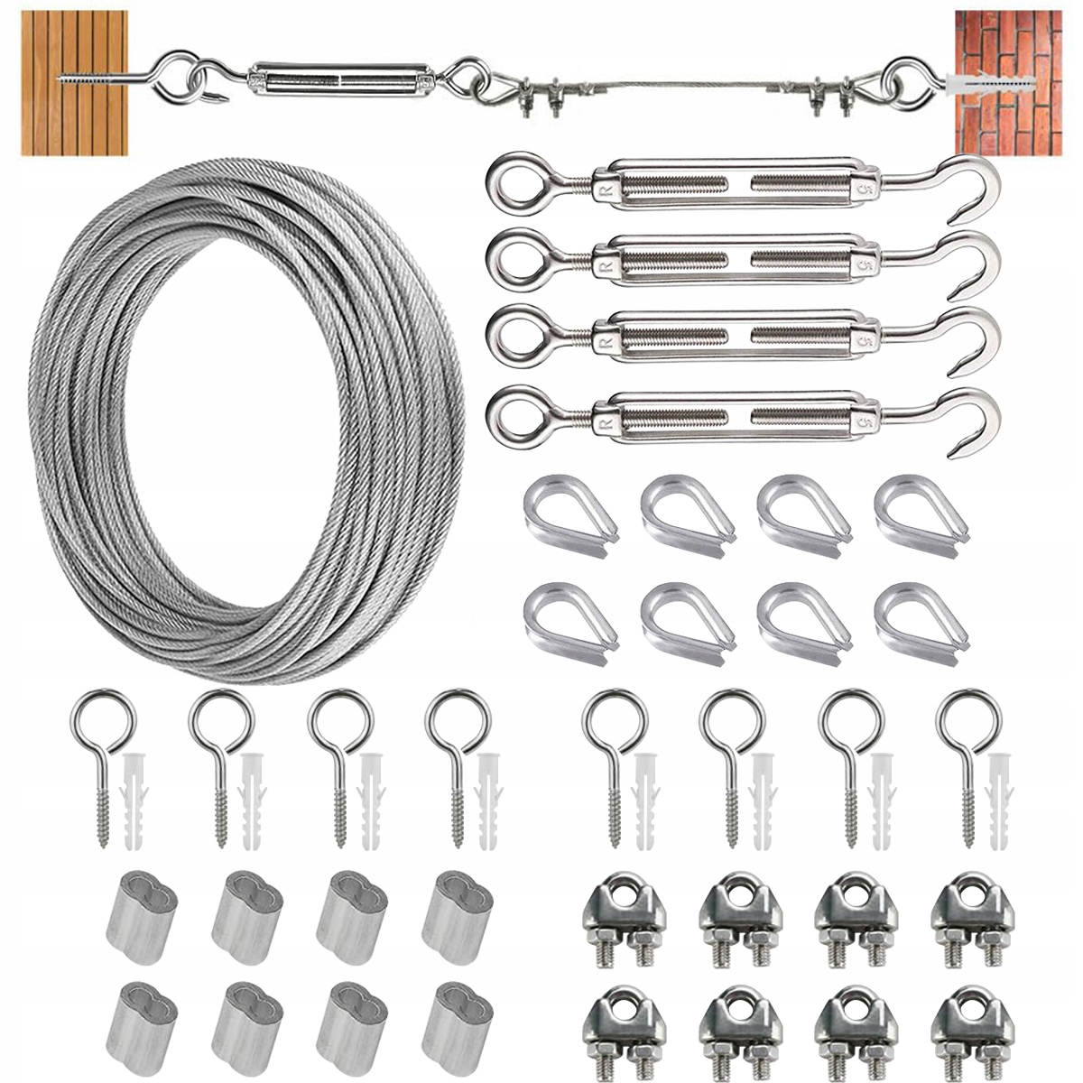 Включені 1 x сталевий мотузок 20 м φ 3 мм, 4 х М5 натягувач з гачком і оком, 8 x m3 очний гвинт M3, 8 x затискачі для сталевих мотузок M3, 8 x пластикове розширення, 8 x м3 сталеві лінії, 8 x алюмінієвих затискачів тиск M3.