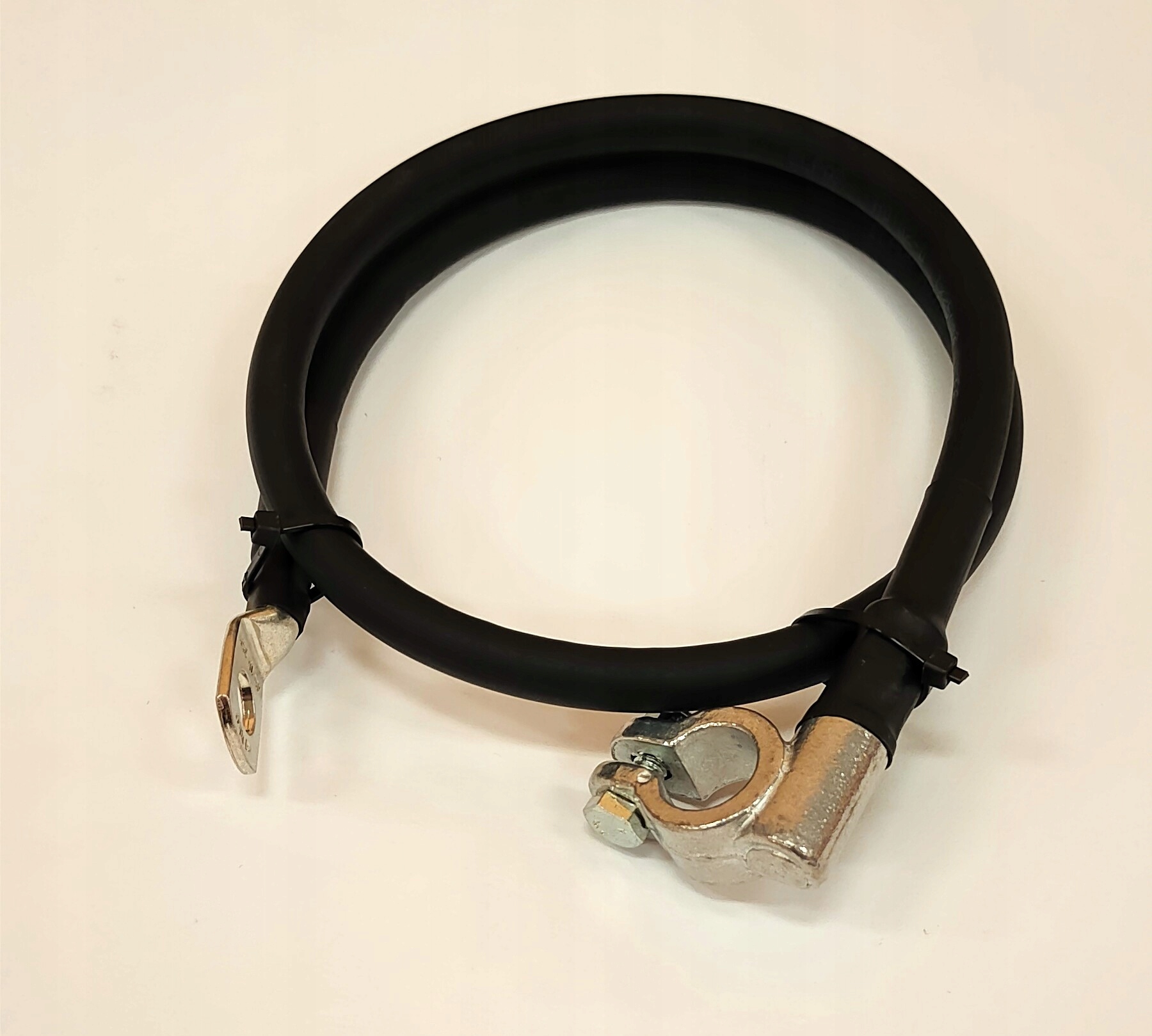Предметом пропозиції є кабель заземлення для акумулятора. Кабель має мінусову клему на одному кінці та мідну кільцеву клему, покриту оловом, на іншому. І наконечник, і затискач міцно притиснуті до кабелю за допомогою гідравлічного преса