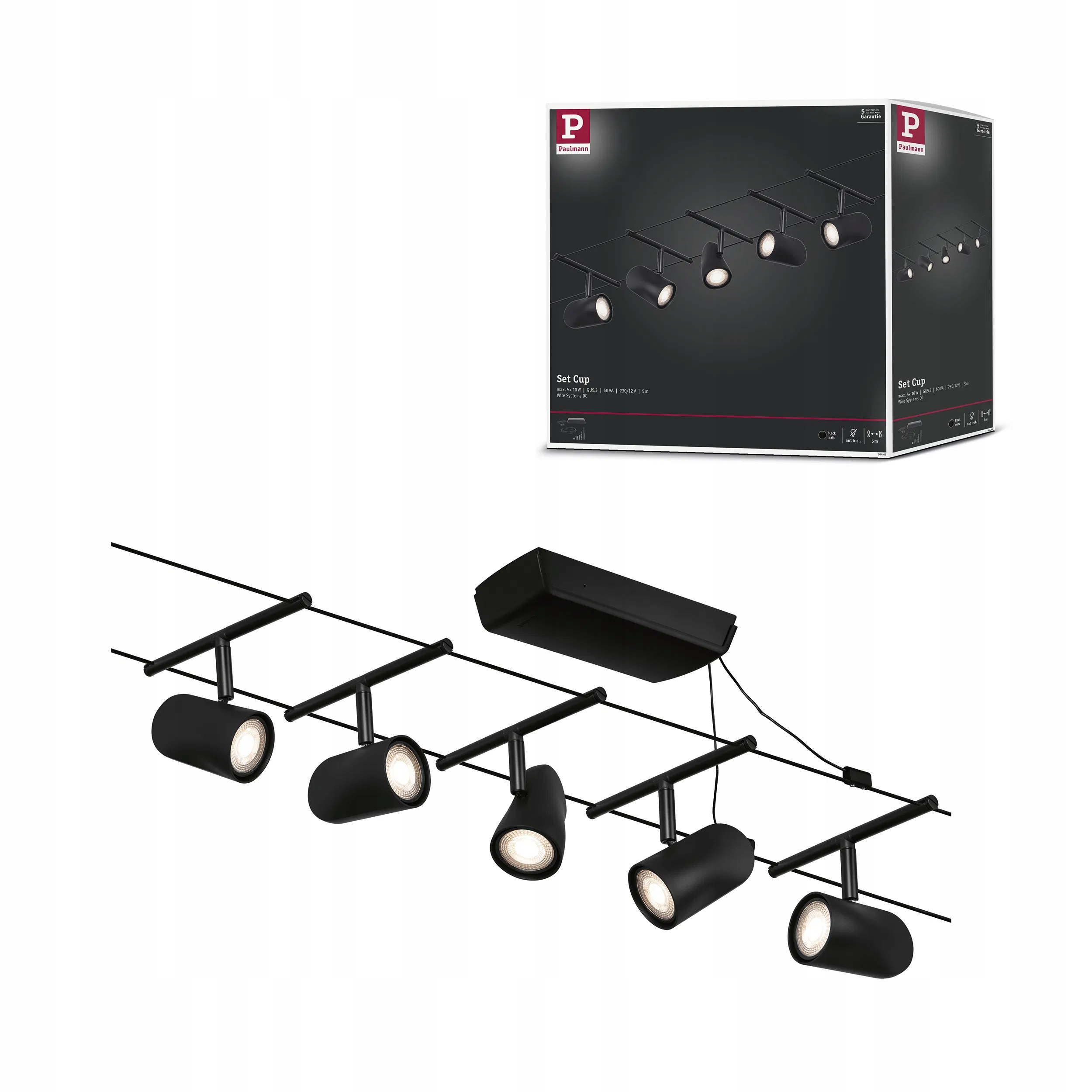 Серію Cup у кольорі Matte Black#Chrome із 5 безламповими точками можна встановити на стіну чи стелю, що забезпечує необмежені можливості дизайну. Прямі, похилі або кутові - кабельні системи підходять для будь-якого приміщення і є ідеальним рішенням проблеми в складних умовах монтажу. Базовий комплект можна доповнити індивідуальними спотами, дефлекторами та іншими аксесуарами. Кабель довжиною 10 м можна розділити посередині, щоб систему можна було підвісити макс. відстань 5м. Система забезпечує оптимальний розподіл світла та може бути легко розширена, якщо потрібно більше освітлення. Для розподілу світильників по кімнаті потрібна лише одна розетка. Системи з технологією 12 В постійного струму не можуть бути затемнені за допомогою настінного перемикача.