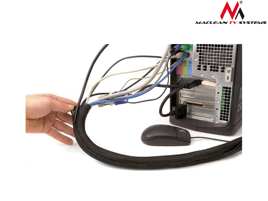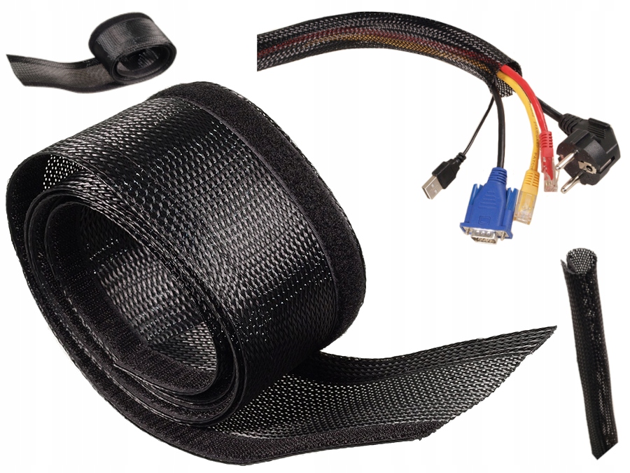 зроблено з гнучкого матеріалу , завдяки плетеній структурі ви можете розтягнути її та адаптуватися до різної кількості кабелів та їх товщини. Є липучка, що дозволяє легко прикріпити та захищати кабелі всередині кришки. Вам не потрібно перетягувати кабелі по всій довжині, просто покладіть їх всередину і підключити липучку.