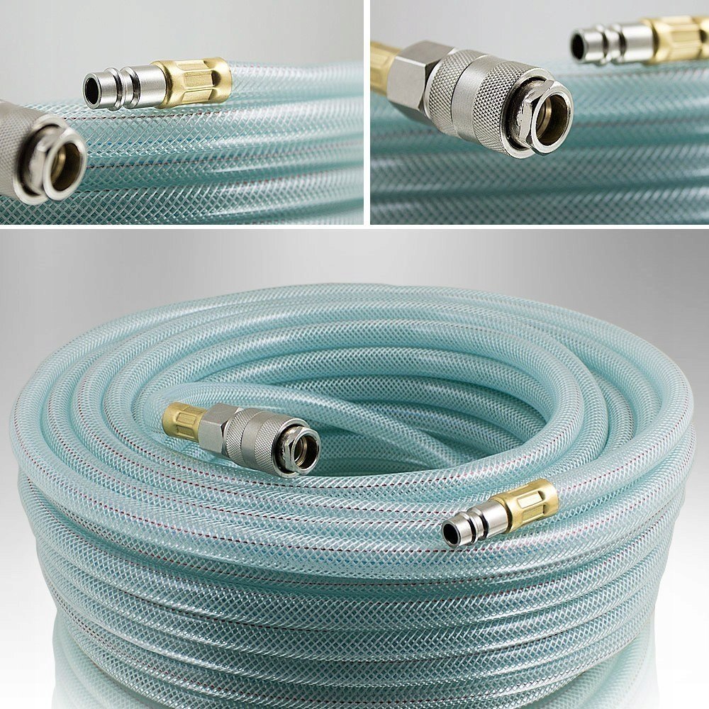корисно під час роботи в робочому майданчику, саду або вдома. Довжина 10 м дозволить зручну роботу, а універсальний роз'єм 1/4 дюйма дозволить підключитися до більшості пневматичних пристроїв. Шланг був виготовлений з ПВХ -пластику, що робить його дуже стійким до пошкодження, навіть при тиску 20 бар.