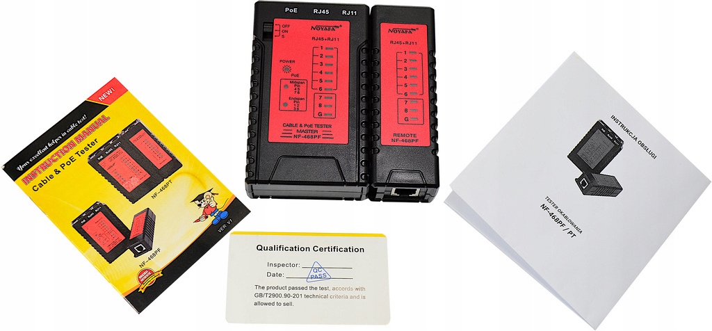 Тестер, призначений для тестування кабелів UTP, STP/FTP, закінчених штекерами RJ 45 і телефонні кабелі RJ-11. Дозволяє перевірити джерело живлення PoE (світлодіодні індикатори пари).