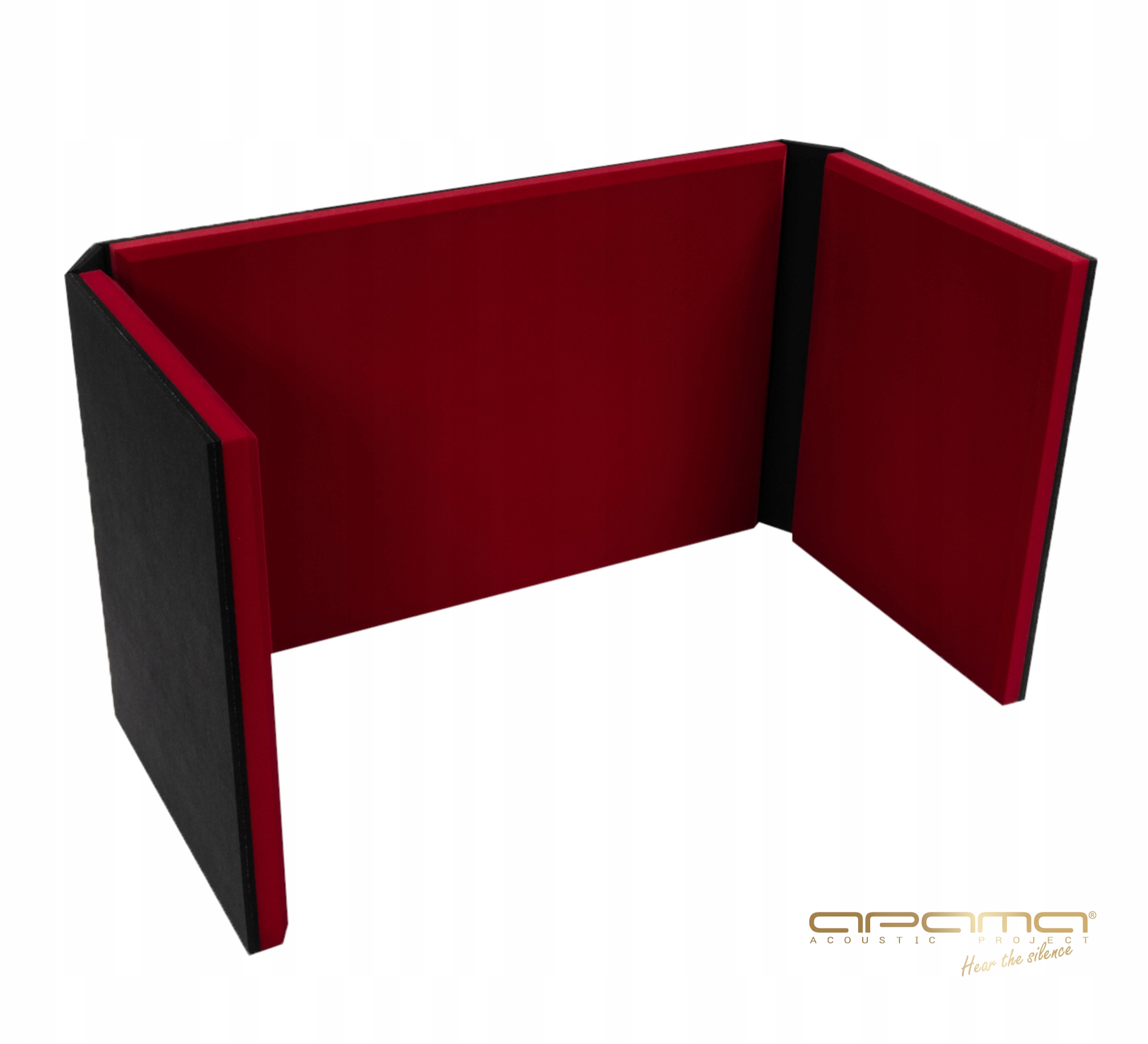 Оздоблення глибокого червоного відтінку та практичного чорного повсті, воно вдало поєднує функціональність з естетикою. Завдяки легкій конструкції, що складається, екран надзвичайно мобільний — ви можете встановити його на будь-якому столі всього за кілька секунд, створюючи професійний звукопоглинальний простір.