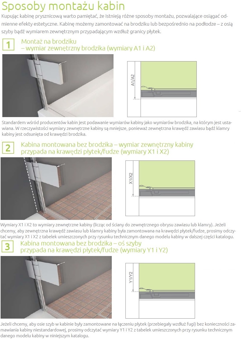 - УВАГА! Стандартні кабіни розраховані на встановлення на душовий піддон певних розмірів, які вказані в назві кабіни або її частини. Фактичні габаритні розміри кабіни трохи менше номінальних розмірів, вказаних у назві артикула. Якщо ви плануєте встановити кабіну прямо на підлогу, зверніть увагу на габаритні розміри (X1, X2) і розміри до осі скла (Y1, Y2), які вказані на технічному кресленні. ul>