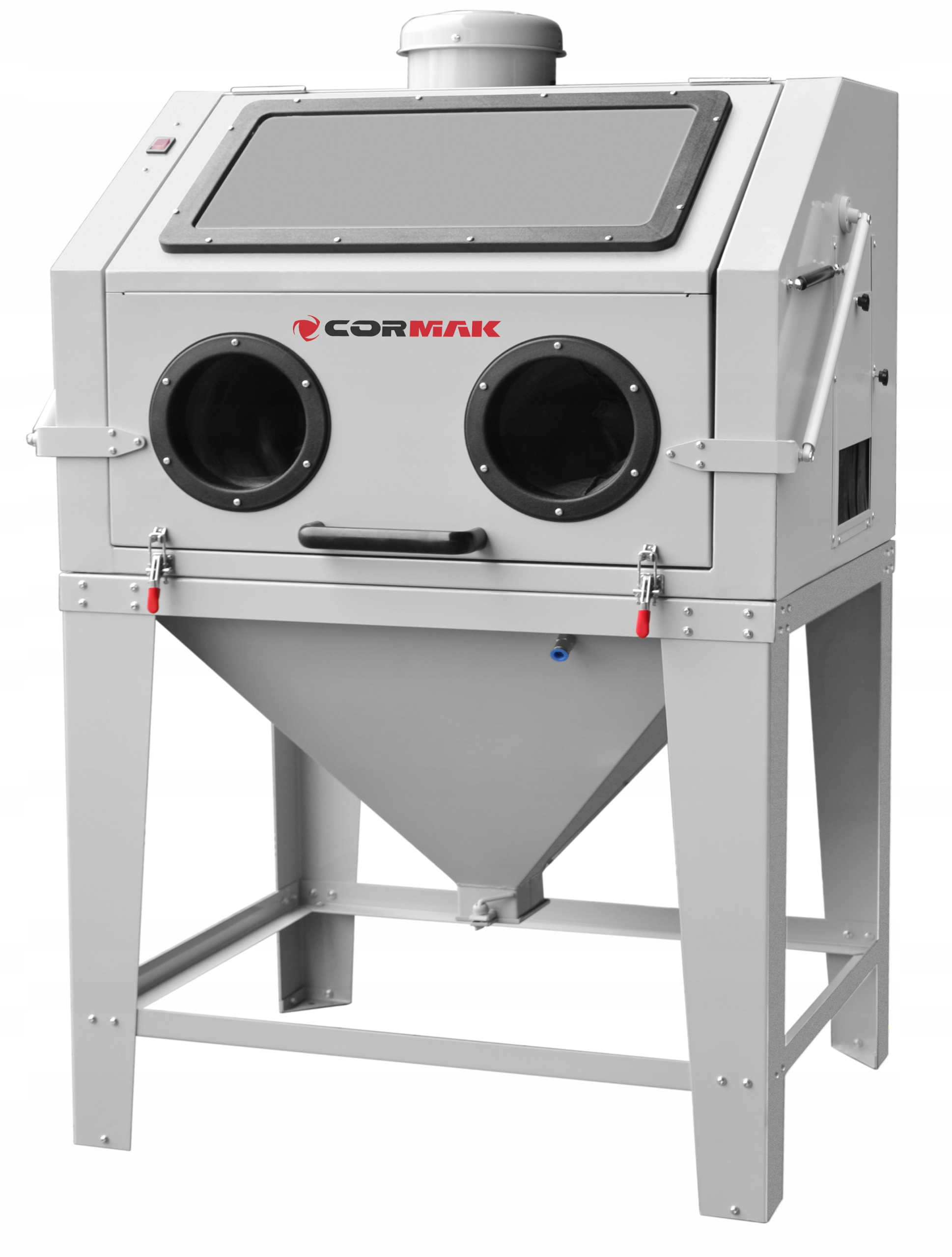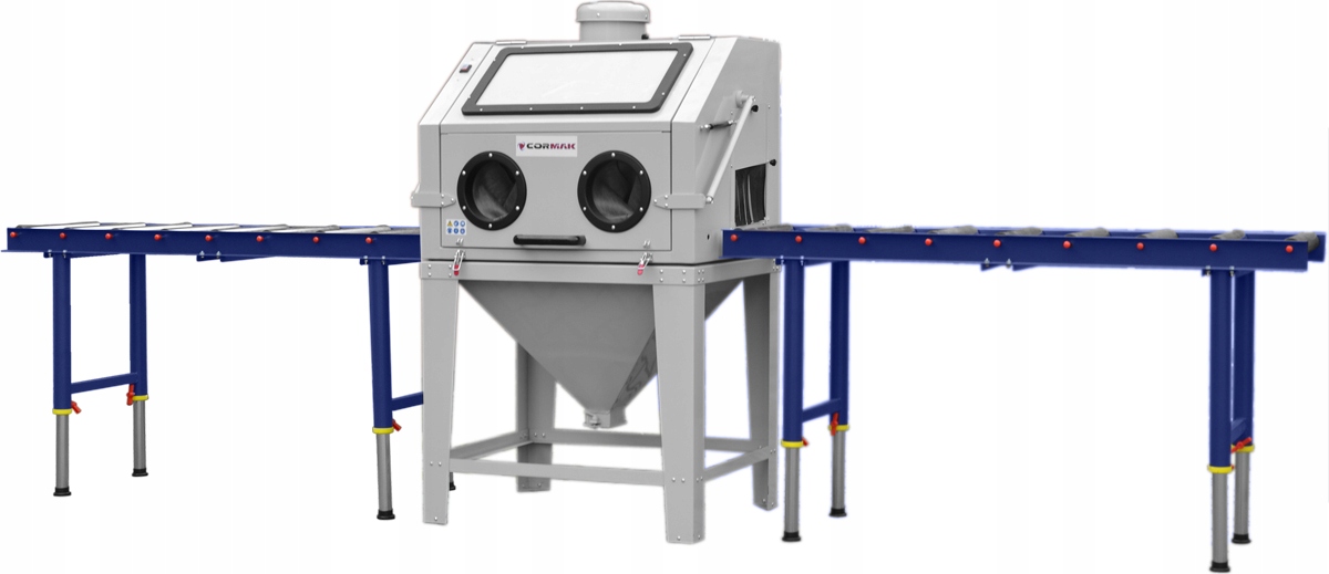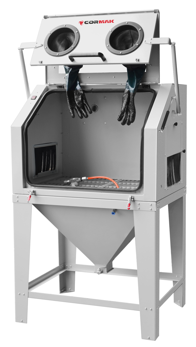 Піскоструминна машина повністю укомплектована, оснащена перевіреною системою управління, міцна та велика кабіна з передніми дверима, що відкриваються, піскоструминним пістолетом, вісьмома керамічними насадками, якісними робочими рукавичками, освітленням робочого місця, великим вікном - вічком (без сліпих зон), пилозбірником та циклонним фільтром. Рекомендований пристрій, окрім компактної конструкції та великого та місткого робочого простору, забезпечує простоту використання, надійність та безпеку експлуатації.