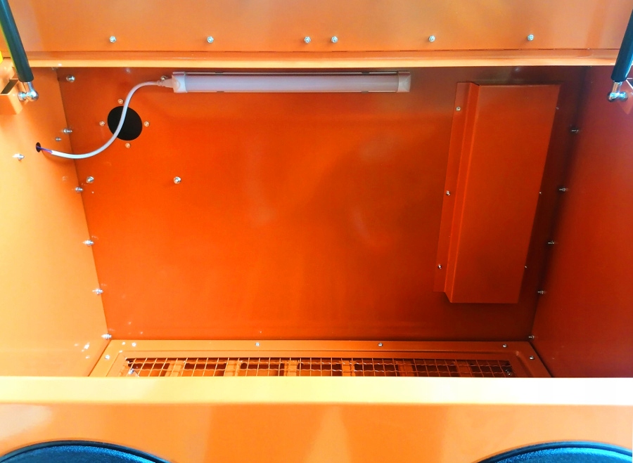 Чудовий кабінний піскоструминний апарат ємністю 250 л, підключений до компресора, дозволяє швидко та ефективно очищати поверхню.