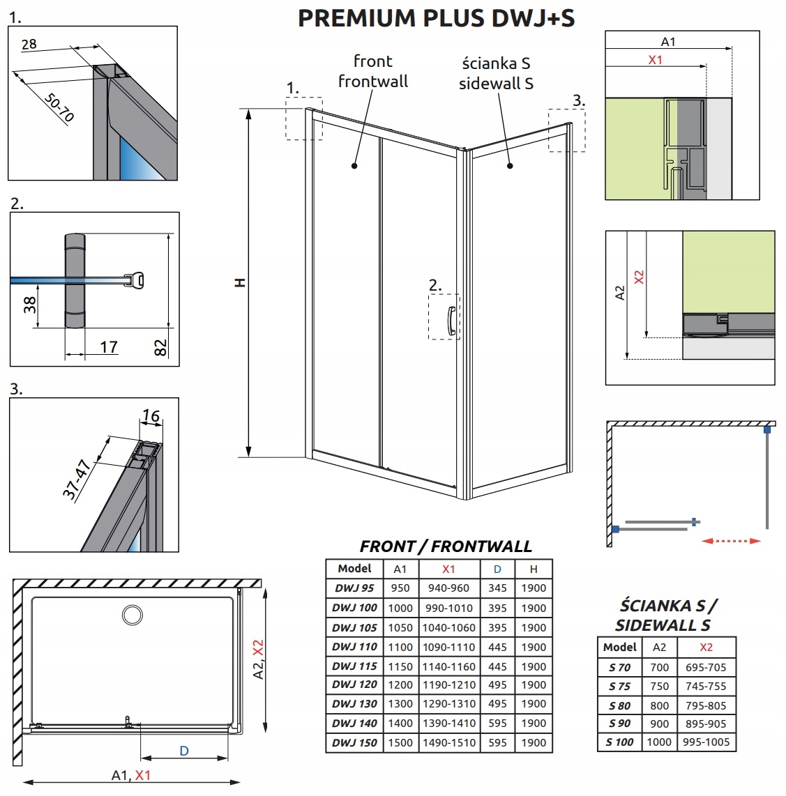 - Кабіна Premium Plus має можливість використання подовжуючих профілів U2 см або U4 см (опція оплачується додатково)