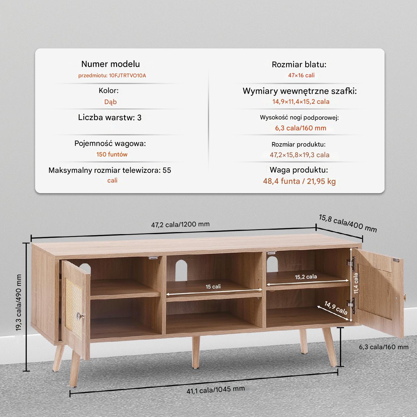 Boho RTV Cabinet Mid-Mid Century Modern Style, Rattan, зробити телевізор 55 ", дуб