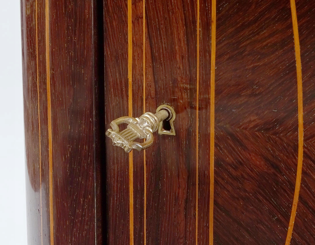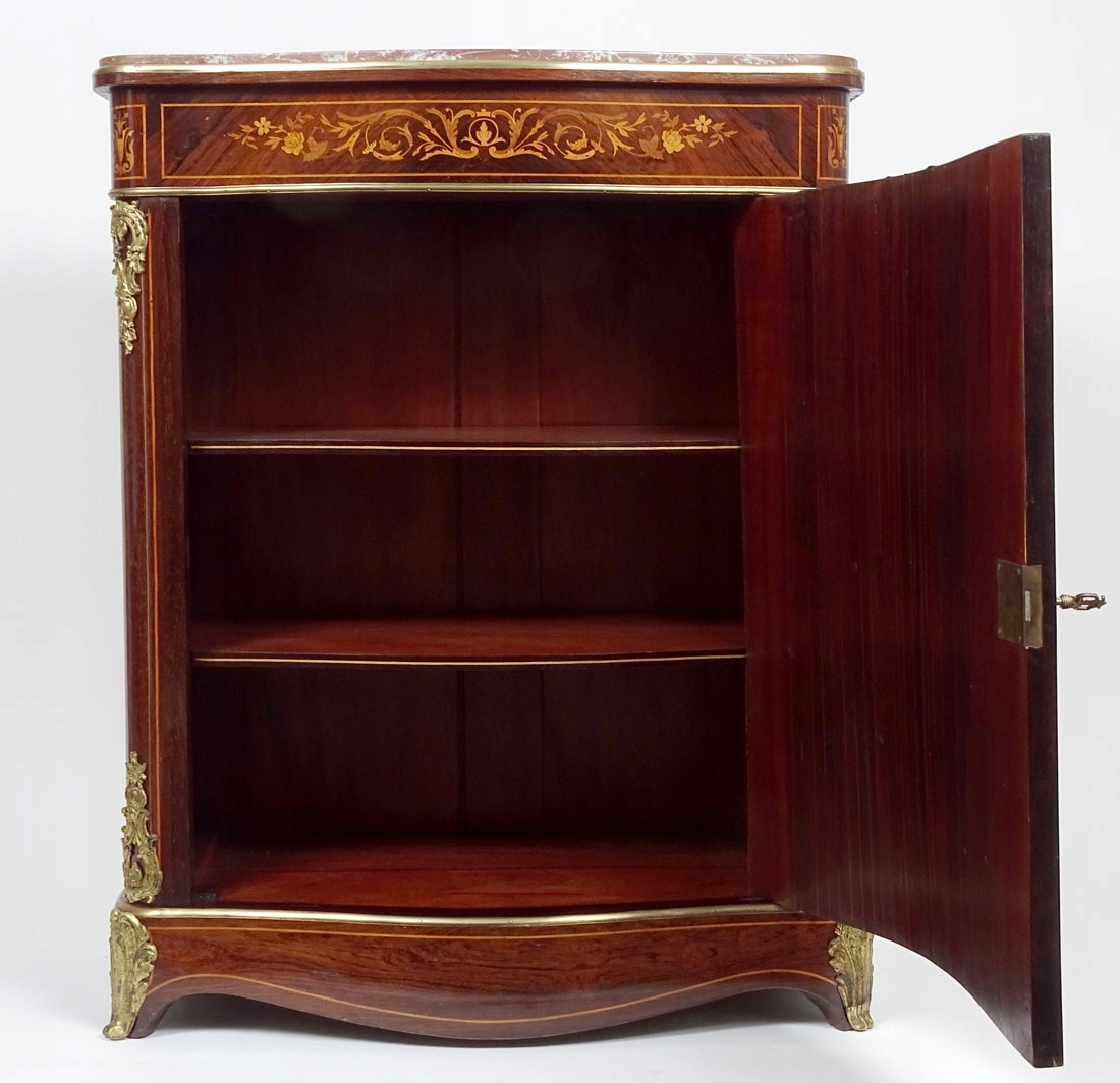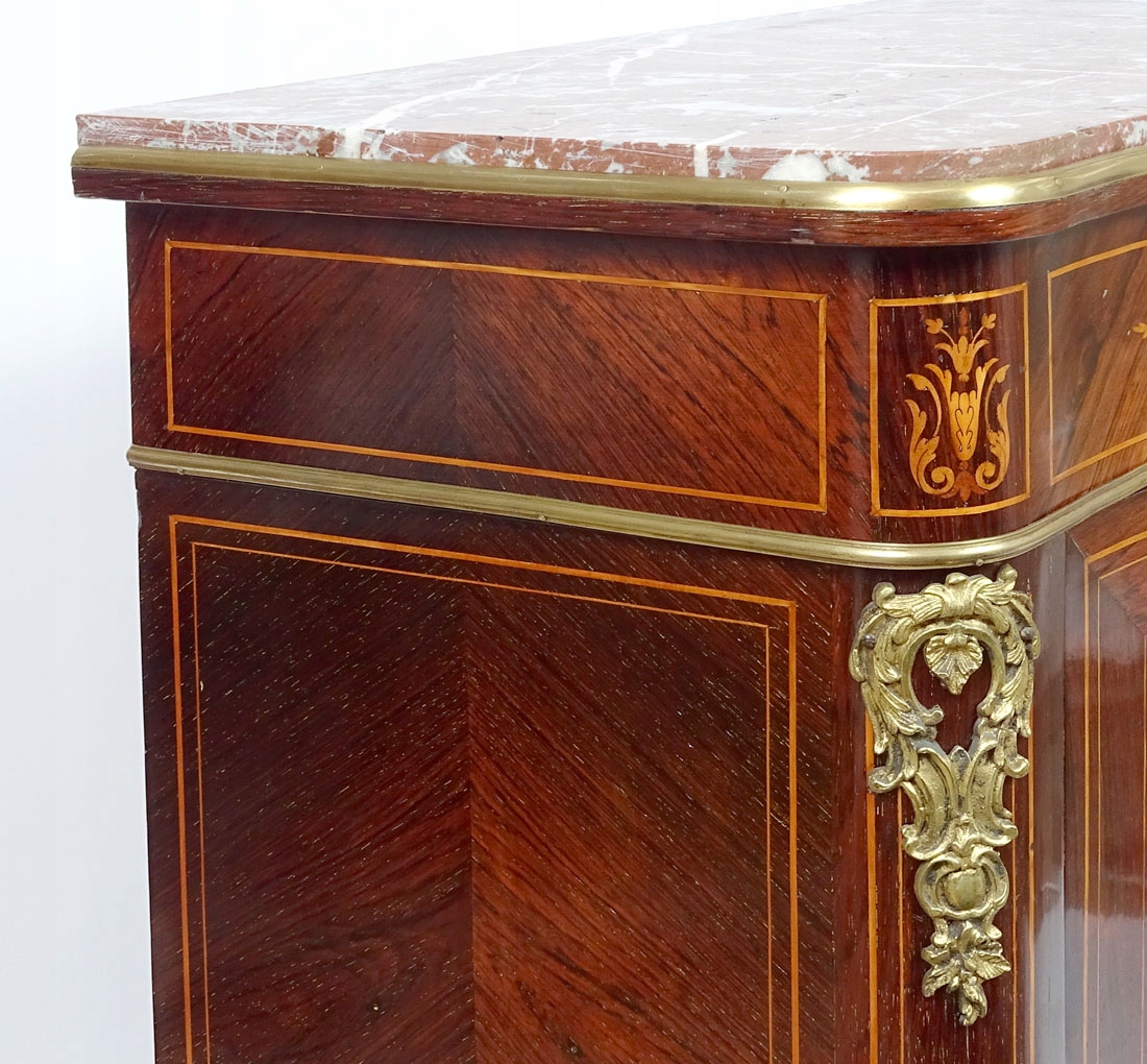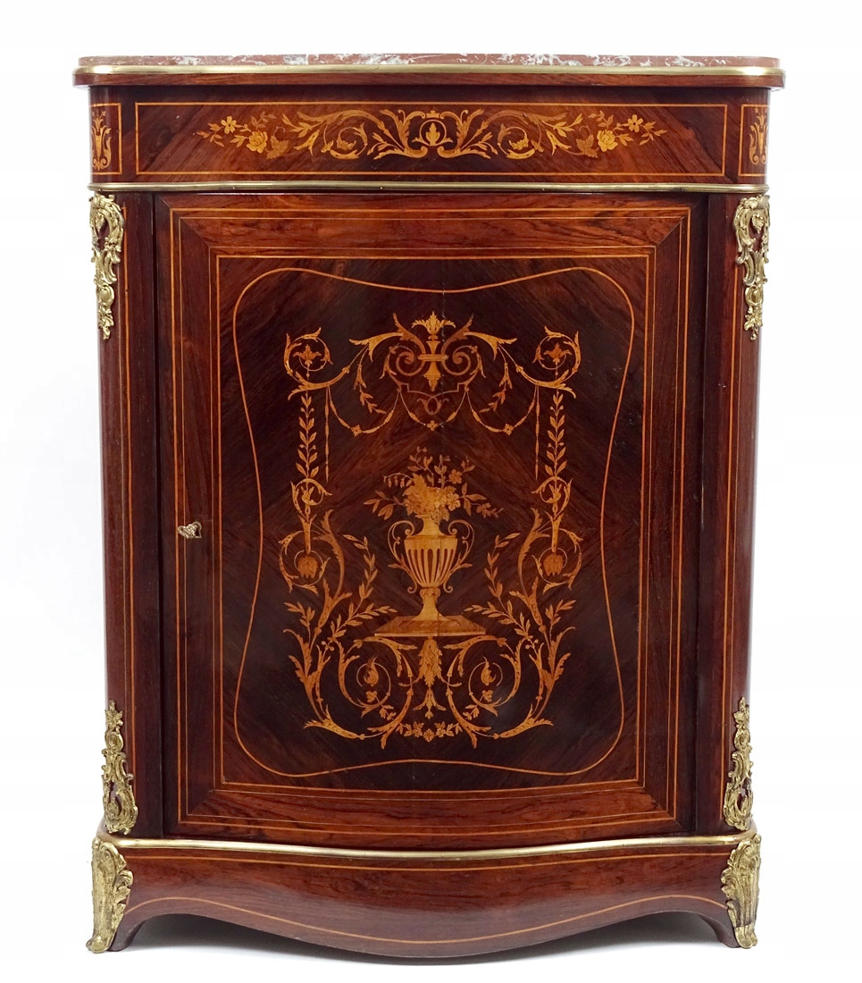 з прямими боками та хвилястою передньою частиною, закрита одними дверцятами, спирається на чотири ніжки, які є продовженням нижньої планки . Двері меблів багато інкрустовані квітковими візерунками, а на столі стоїть ваза з букетом квітів усередині. Подібним чином оформлена планка під стільницю і верхні елементи передніх кутів. Боковини шафи оздоблені дерев'яними прожилками, а також дверцята і планки, верхня і нижня. Зверху оригінальна мармурова стільниця, на дверях замок з ключем, всередині дві полиці.