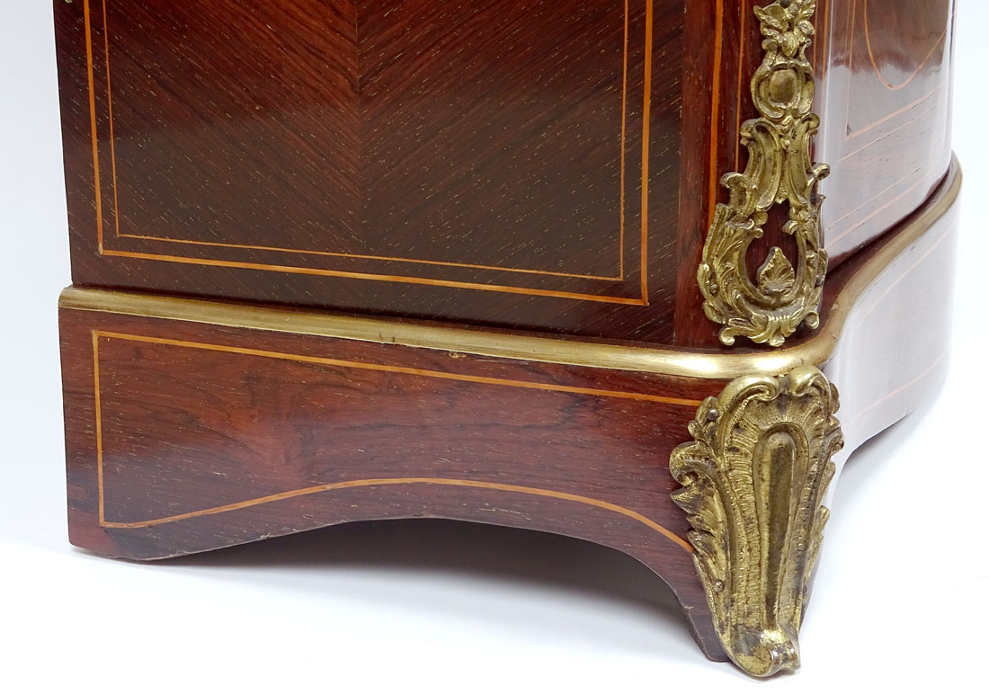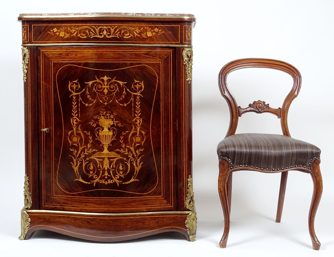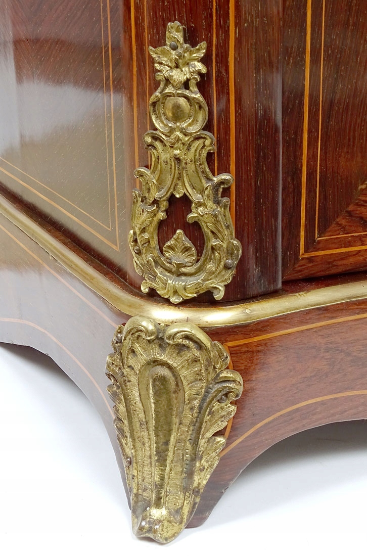 Дубова конструкція, палісандровий шпон, маркетрі з різних порід деревини, латунні планки та фурнітура, подекуди позолочений, мармуровий стіл, середина 19 століття.