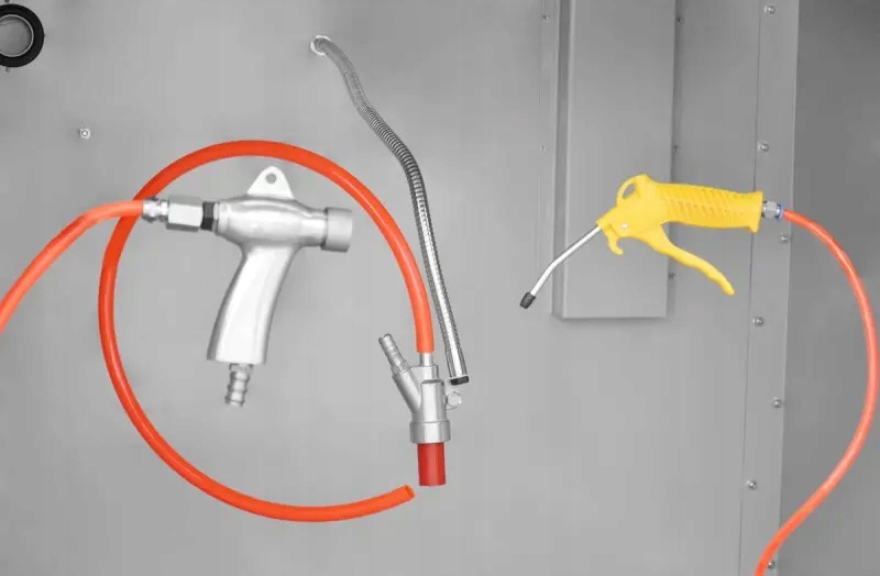 Шлангова піскоструминна система розміщена в нижній частині збірного контейнера. Пристрій працює в замкнутій системі, що запобігає поширенню пилу та мінімізує його викид на робочому місці. Крім того, дренажний отвір дозволяє швидко і легко змінити піскоструминний матеріал.