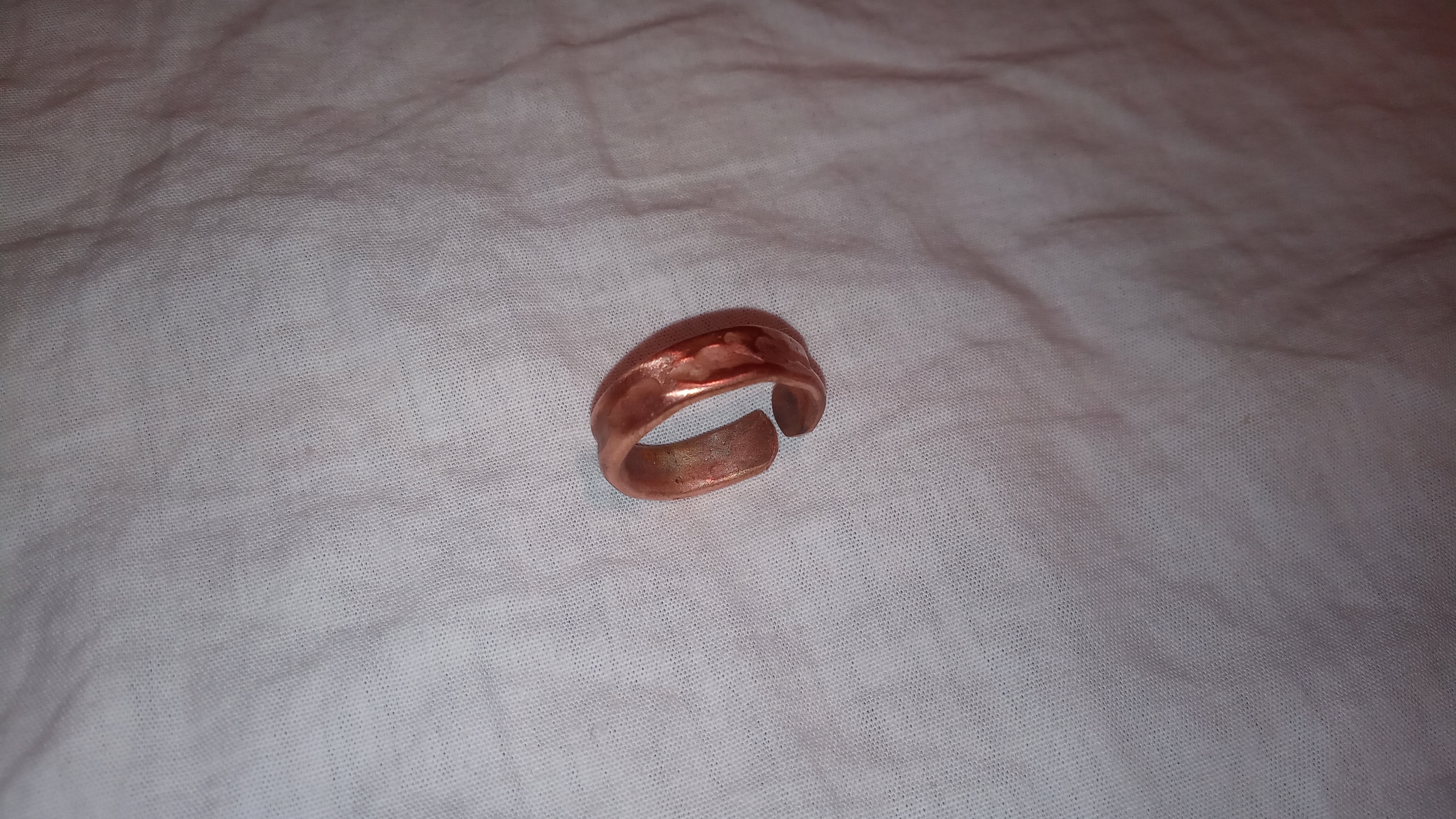 Перстень - обручка з чистої міді. Ручне кування та текстурування, природний вогненний оксид. Відкритий поперечний переріз, що дозволяє легко регулювати розмір і легко знімати каблучку з пальця. Ви можете одягнути його на великий палець, не турбуючись про те, щоб його зняти.