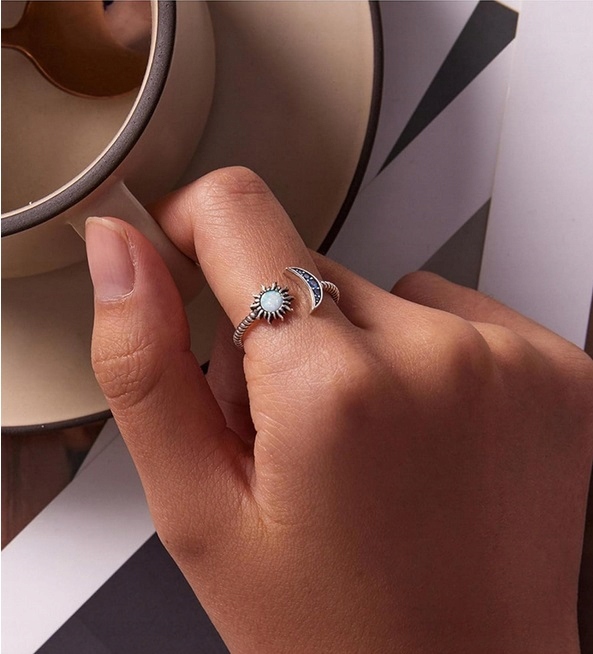 Регульоване кільце з високоякісного срібла S925із зображенням місяця та сонця. Каблучка, прикрашена мерехтливим опалом і синіми фіанітами.