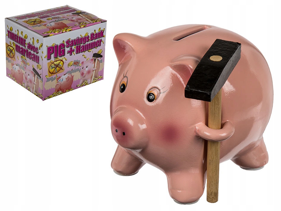 Дуже весела і класична скарбничка у вигляді рожевої веселої свинки. Це веселе порося із задоволенням подбає про ваші заощадження. Воно одноразове, щоб видалити накопичені заощадження, потрібно розбити його молотком, що входить у комплект. Скарбничка упакована в барвисту коробку, ідеально підходить для подарунка.