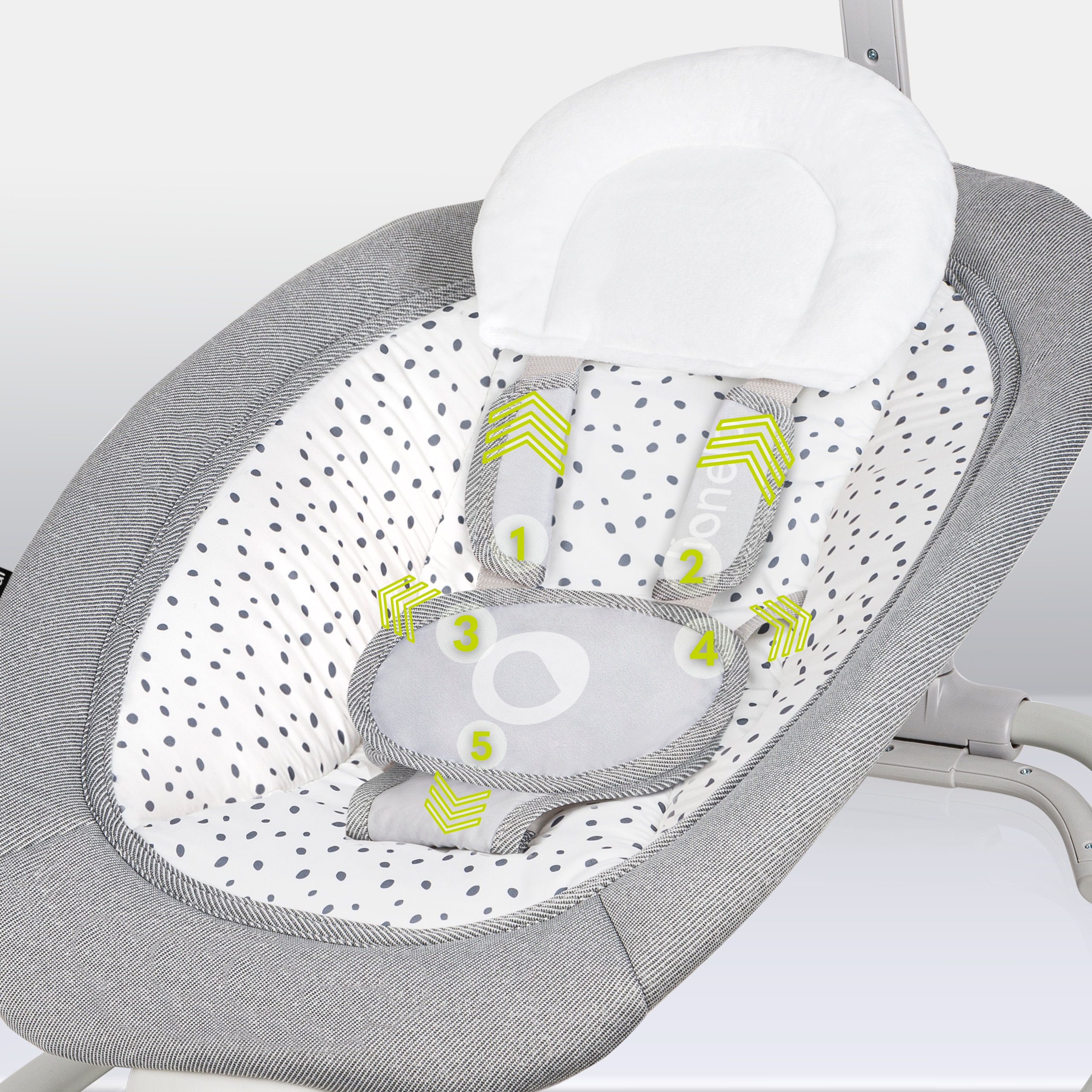 ✔ 5-точкові ремені з стегновим ременем - ремені забезпечують більшу безпеку під час розгойдування. Додаткові подушки підвищують комфорт і запобігають появі потертостей на чутливій шкірі малюка.