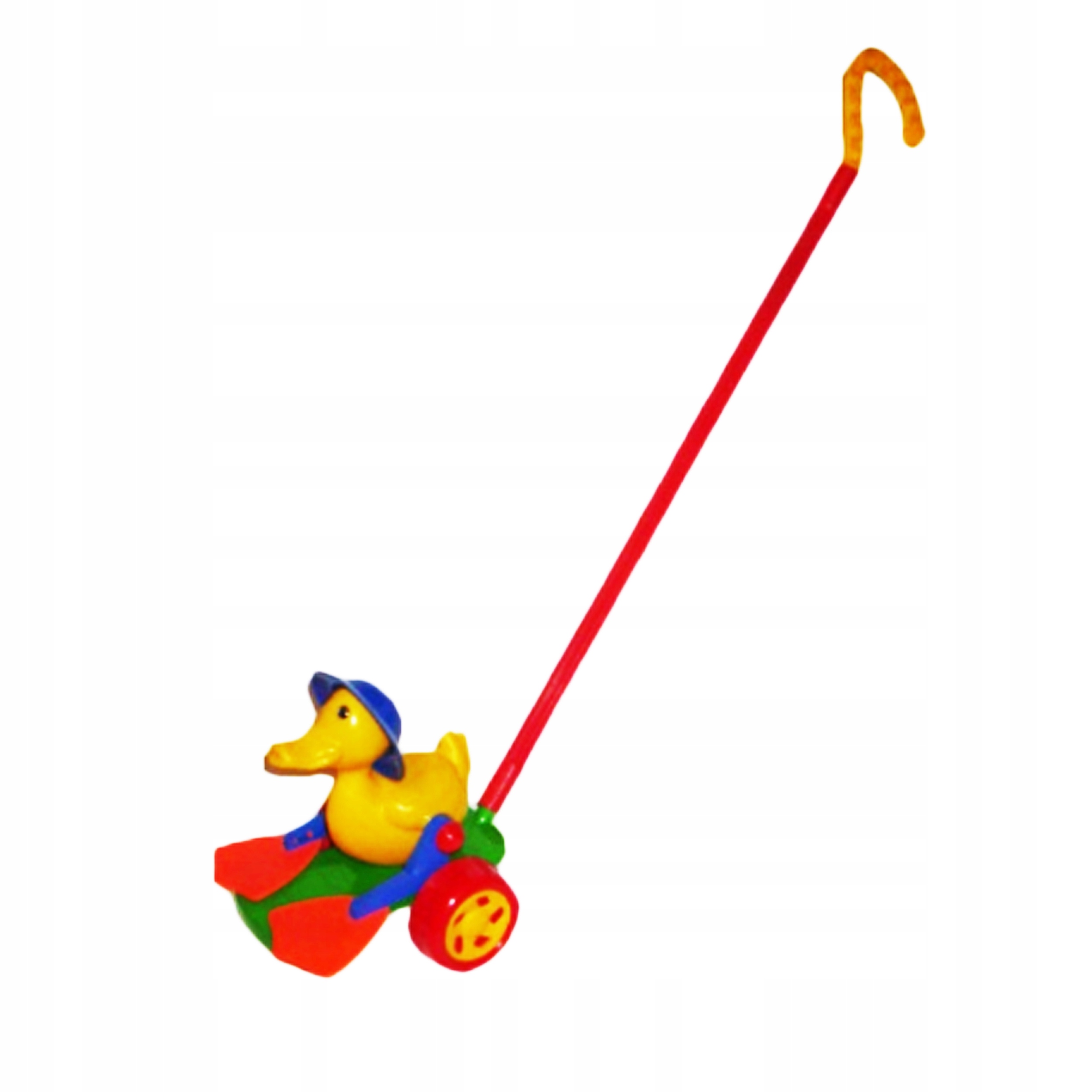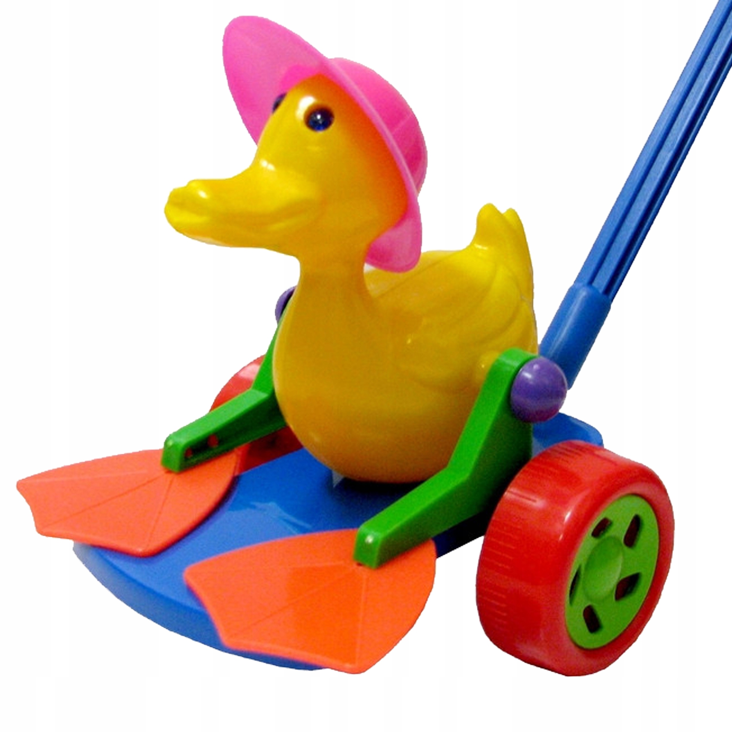 качка в капелюсі, яка клацає ногами, коли дитина штовхає її.