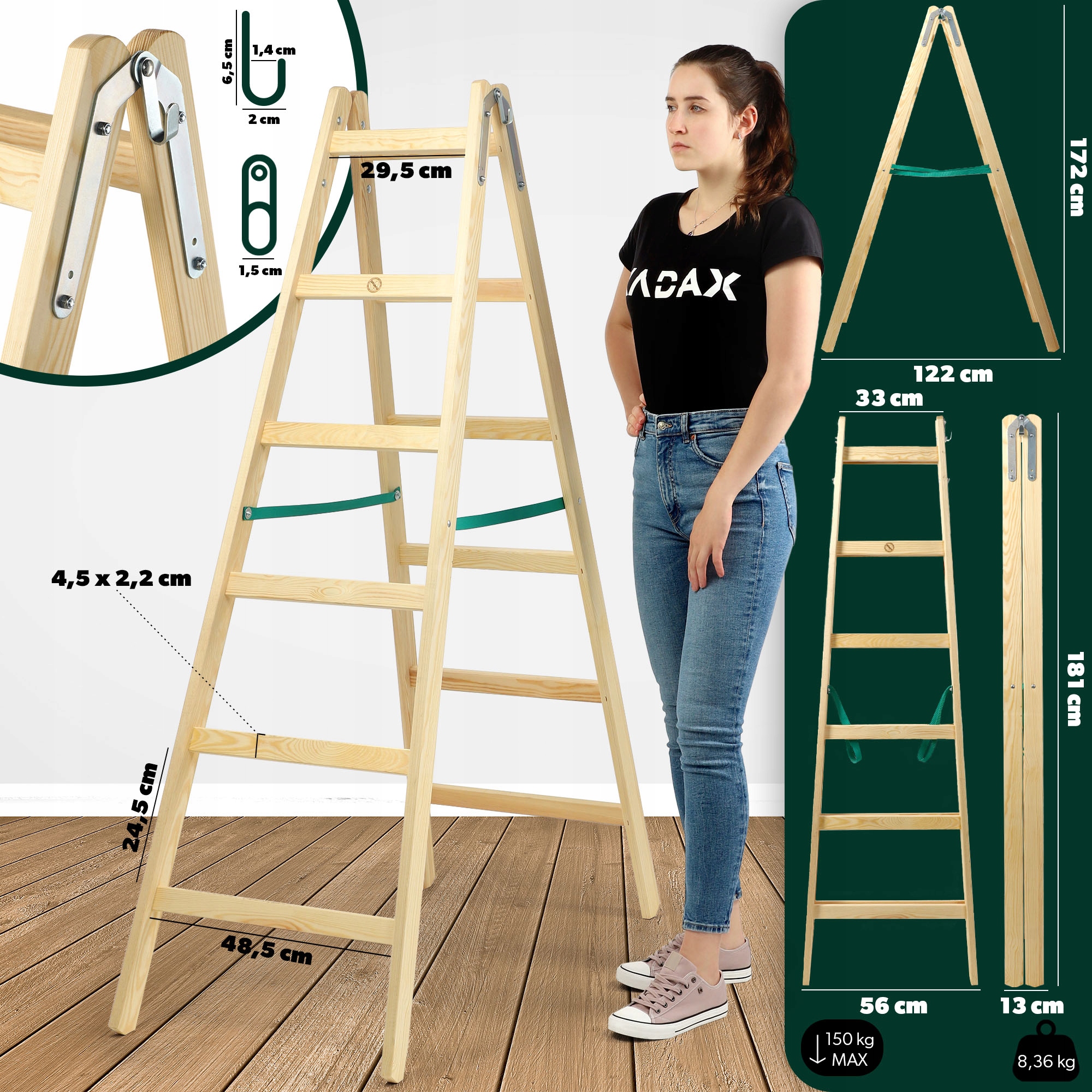 ✅Дерев'яні драбини зі східцями з вантажем ємність 150 кглегко складається та розкладається. Завдяки цьому у вас не виникне проблем з його використанням.